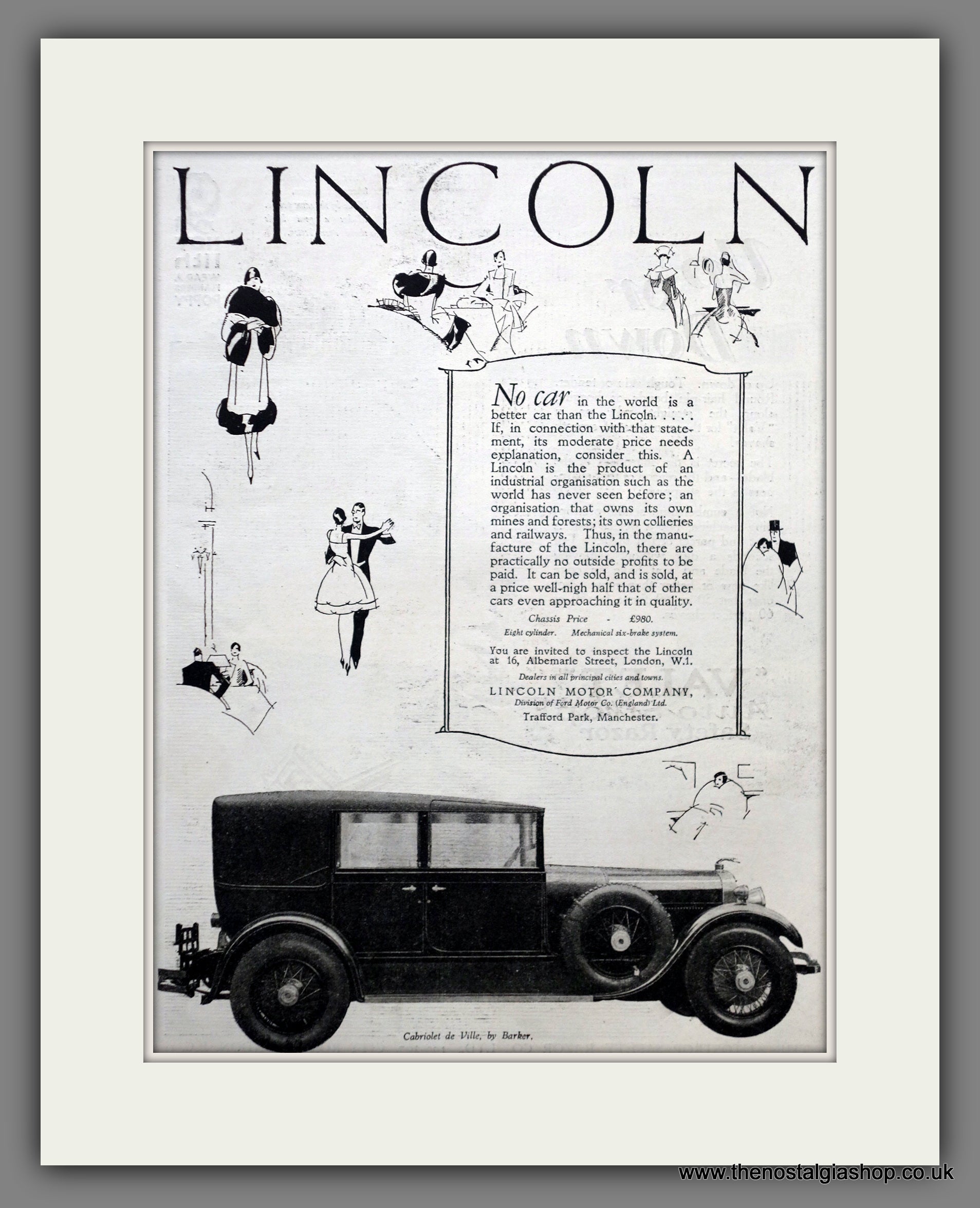 Lincoln Motor Cars. Vintage Advert. Original Advert 1927. Presented and Supplied in cream bevel cut mount, size 14 x 11 inches with backing card and clear bag. Ready to frame. All our adverts, unless clearly stated are Originals from the date shown They make excellent pieces of wall art and stunning gifts. Many are rare and hard to find and once sold, may not be replaced. Remember you are buying a piece of history. Website watermark is not on original.