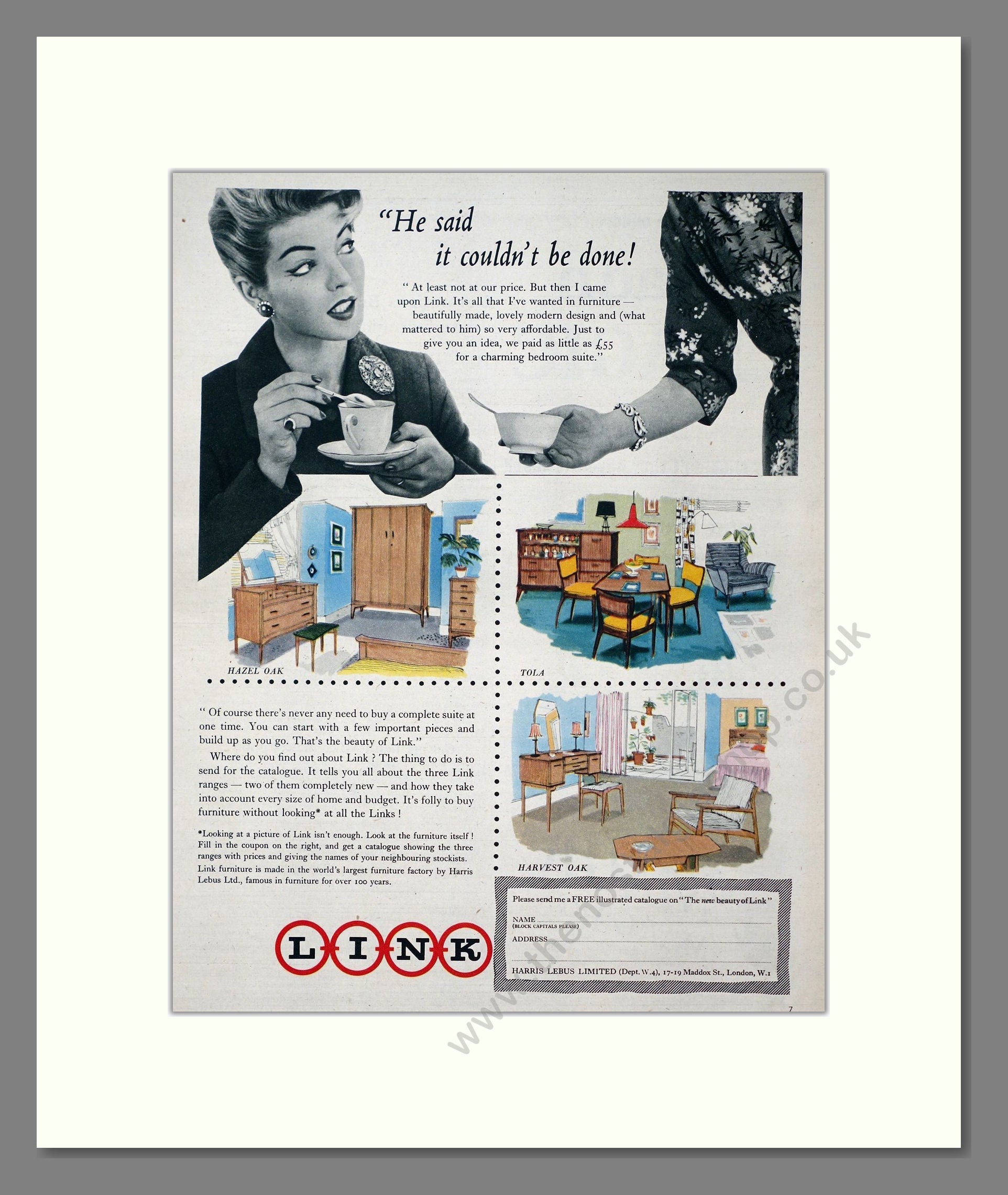 Link - Furniture. Vintage Advert. This is a large classic original advert from 1957. Presented and supplied in a cream bevel cut mount with backing card and clear bag. Ready to fit in a 18 x 14 inches frame. The mounted advert will be posted via courier and well packed - protected with a sheet of hardboard to keep it rigid. Any questions or enquiries, please get in touch, we are here to help! All our adverts, unless clearly stated are originals from the date shown. They make excellent pieces of wall art and stunning gifts. Many are rare and hard to find and once sold, may not be replaced. Remember you are buying a piece of history. Website watermark is not on original.