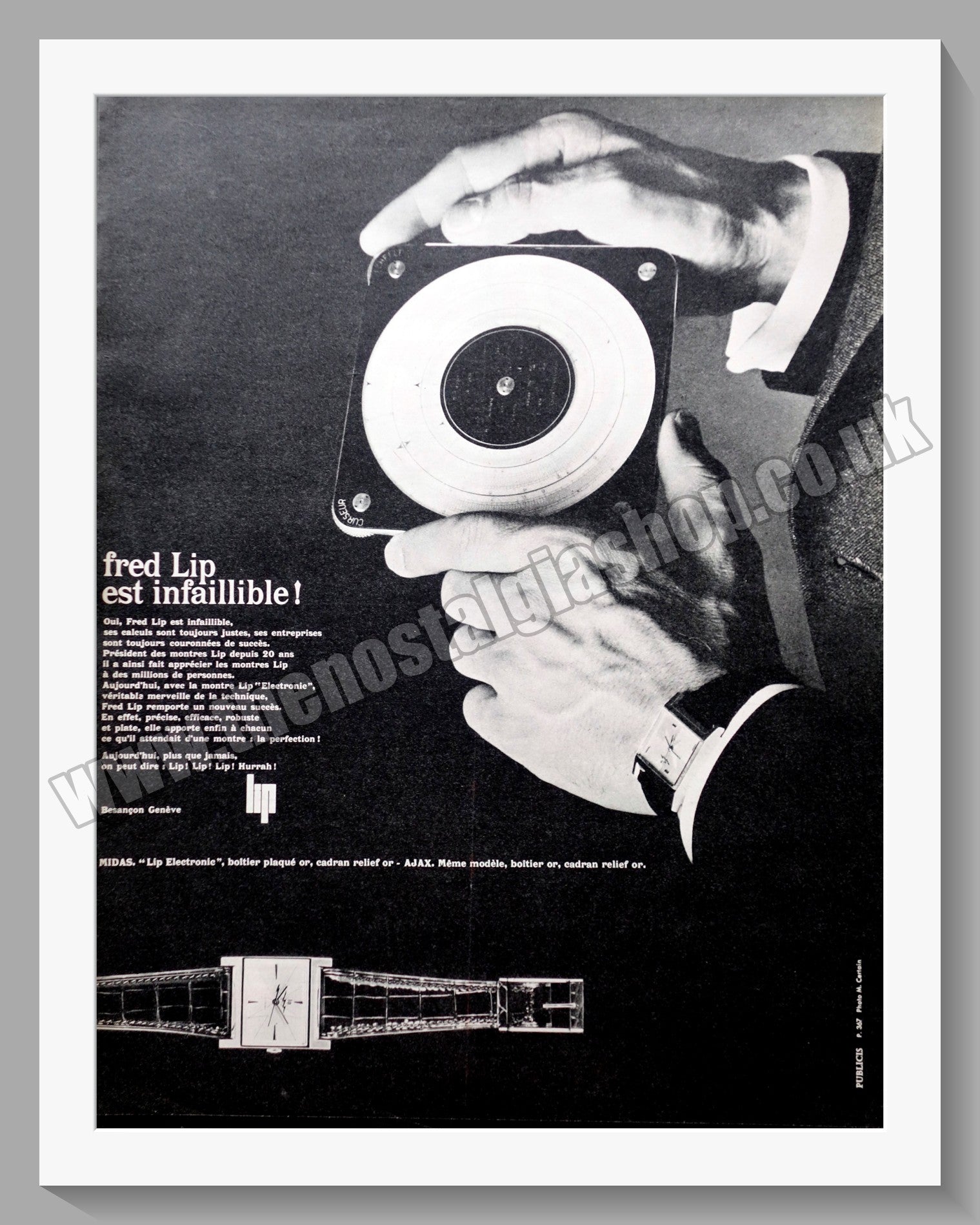LIP Watches. Fred Lip. Large Original Vintage Advert 1963. Presented and Supplied in a cream bevel cut mount with backing card and clear bag. Ready to fit in 18 x 14 inch frame. All our adverts, unless clearly stated are Originals from the date shown. They make excellent pieces of wall art and stunning gifts. Many are rare and hard to find and once sold, may not be replaced. Remember you are buying a piece of history. Website watermark is not on original.
