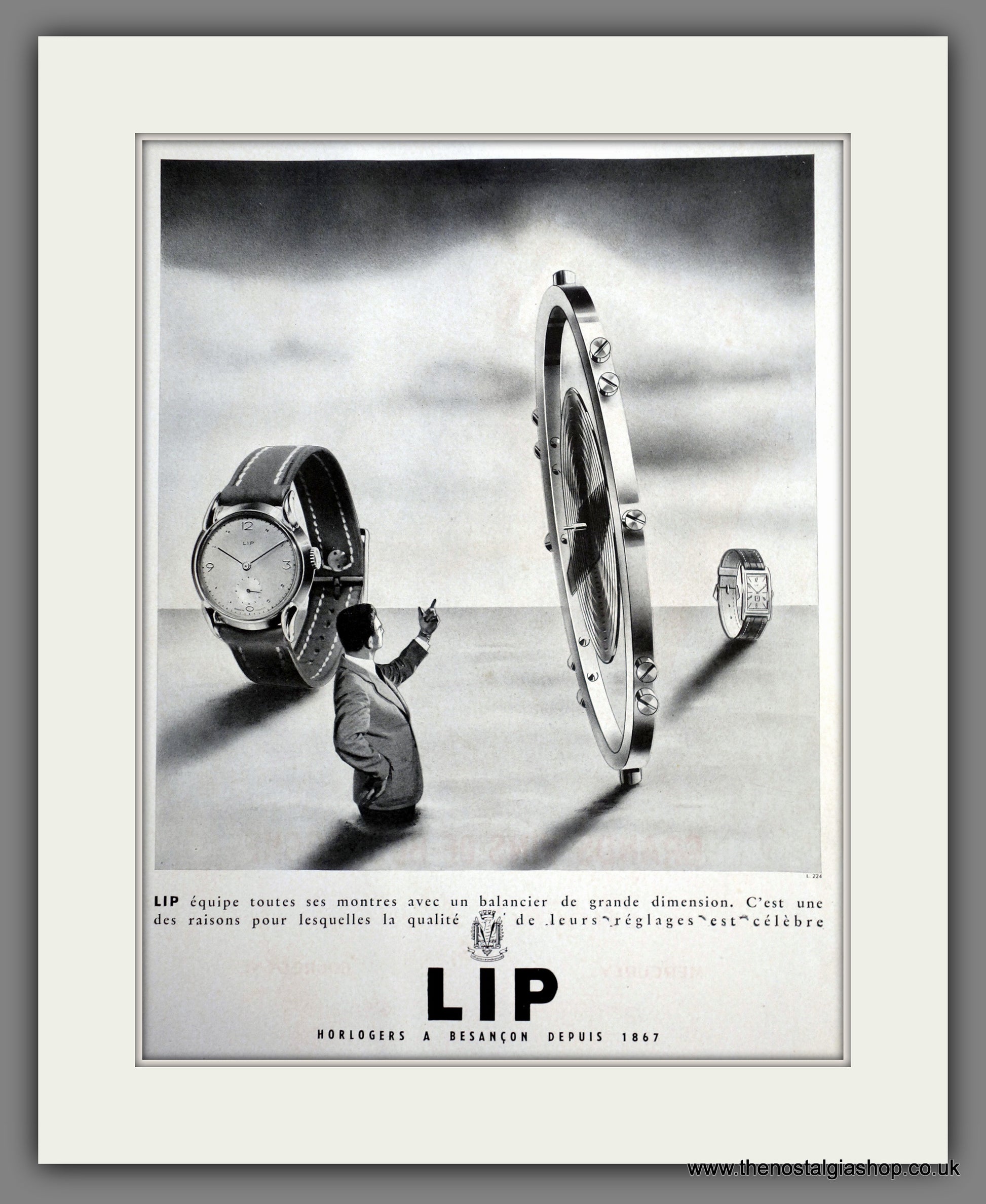 LIP Watches. Original Vintage Advert 1948. Presented and supplied in a cream bevel cut mount with backing card and clear bag. Ready to fit in a 18 x 14 inch frame. All our adverts, unless clearly stated are Originals from the date shown. They make excellent pieces of wall art and stunning gifts. Many are rare and hard to find and once sold, may not be replaced. Remember you are buying a piece of history. Website watermark is not on original.