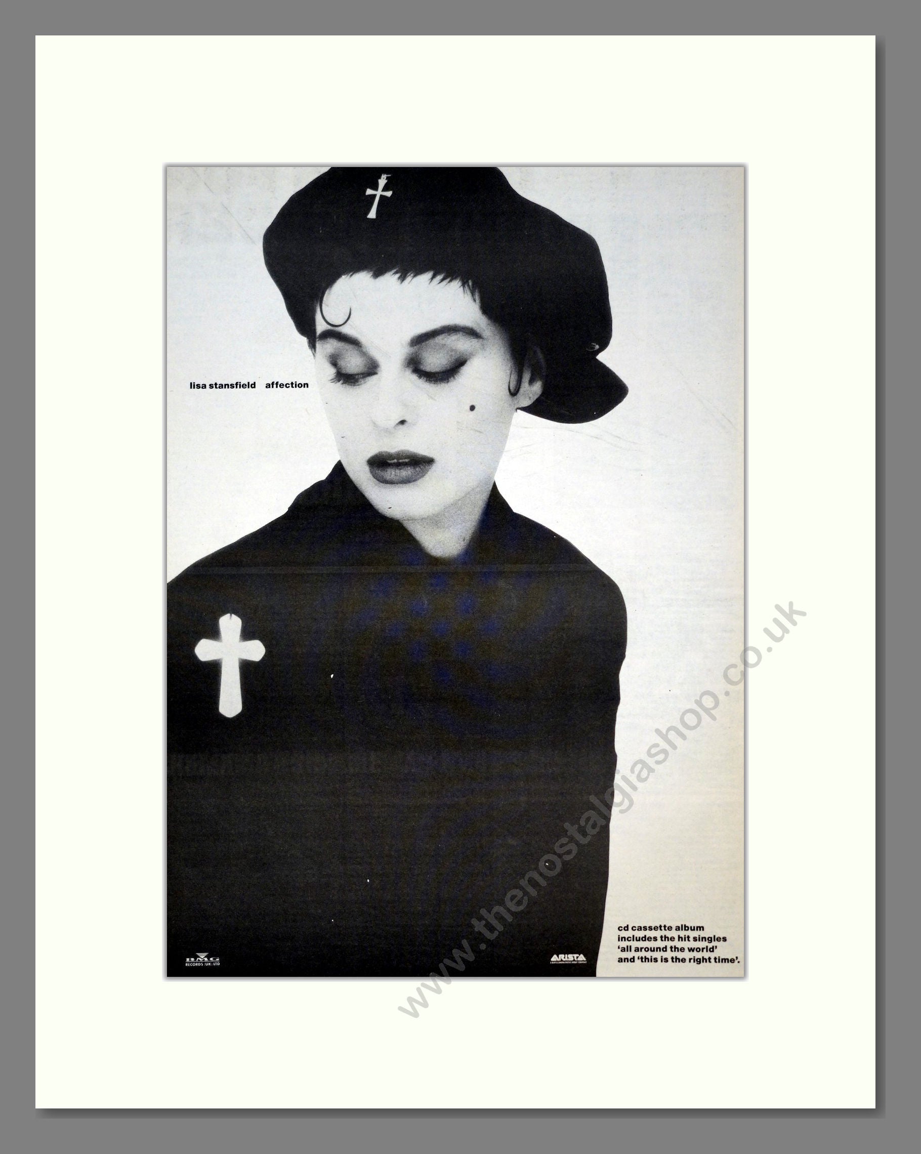 Lisa Stansfield - Affection. Vintage Advert. This is a large classic original advert from 1989. Presented and supplied in a cream bevel cut mount with backing card and clear bag. Ready to fit in a 20 x 16 inches frame. The mounted advert will be posted via courier and well packed - protected with a sheet of hardboard to keep it rigid. Any questions or enquiries, please get in touch, we are here to help! All our adverts, unless clearly stated are originals from the date shown. They make excellent pieces of wall art and stunning gifts. Many are rare and hard to find and once sold, may not be replaced. Remember you are buying a piece of history. Website watermark is not on original.