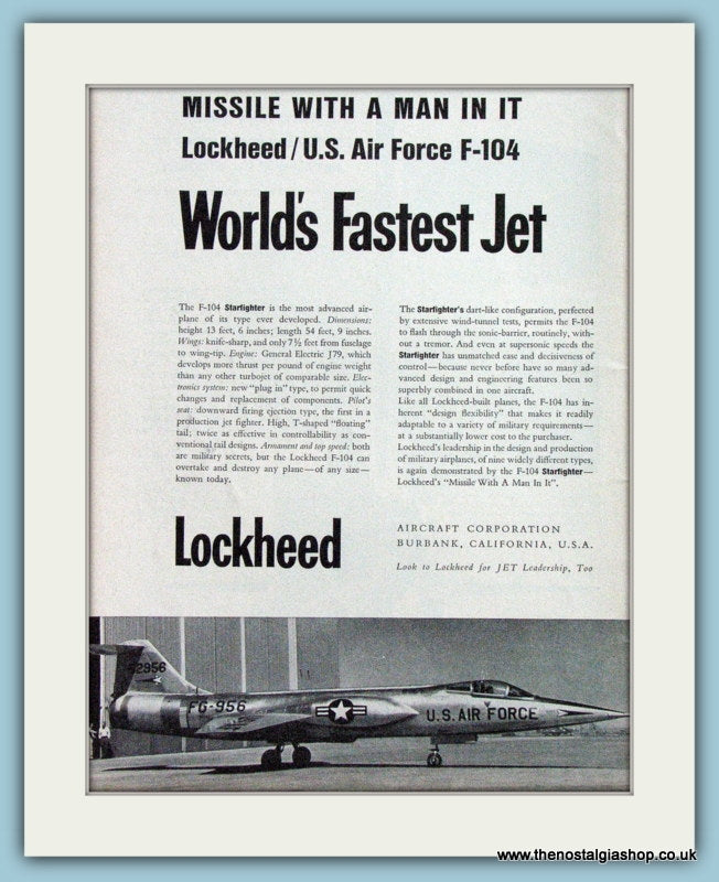 Lockheed F-104. Missile with a man in it. Classic original advert 1956. Presented in cream bevel cut mount with backing card and clear bag. Ready to fit in 14 x 11 inch frame. Want it framing? If so, buy this then go to Frames Available Category. Click to buy on the suitable frame and we will do the rest. All our adverts, unless clearly stated are Originals from the date shown. They make excellent pieces of wall art and stunning gifts. Many are rare and hard to find and once sold, may not be replaced. Remember you are buying a piece of history. Website watermark is not on original.