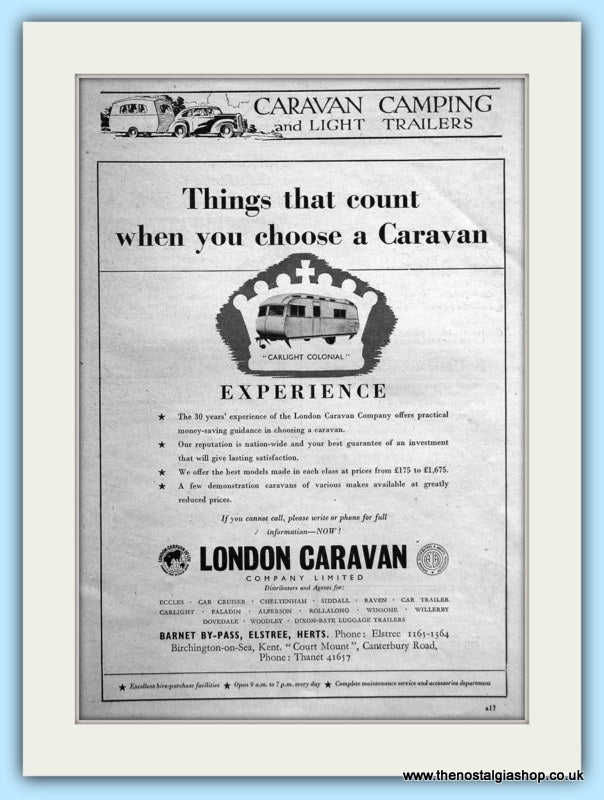 Carlight Colonial Caravans. Things that count when you choose a caravan. Classic original advert 1953. Presented in cream bevel cut mount with backing card and clear bag. Ready to fit in 14 x 11 inch frame. Want it framing? If so, buy this then go to Frames Available Category. Click to buy on the suitable frame and we will do the rest. All our adverts, unless clearly stated are Originals from the date shown They make excellent pieces of wall art and stunning gifts. Many are rare and hard to find and once sold, may not be replaced. Remember you are buying a piece of history. Website watermark is not on original.