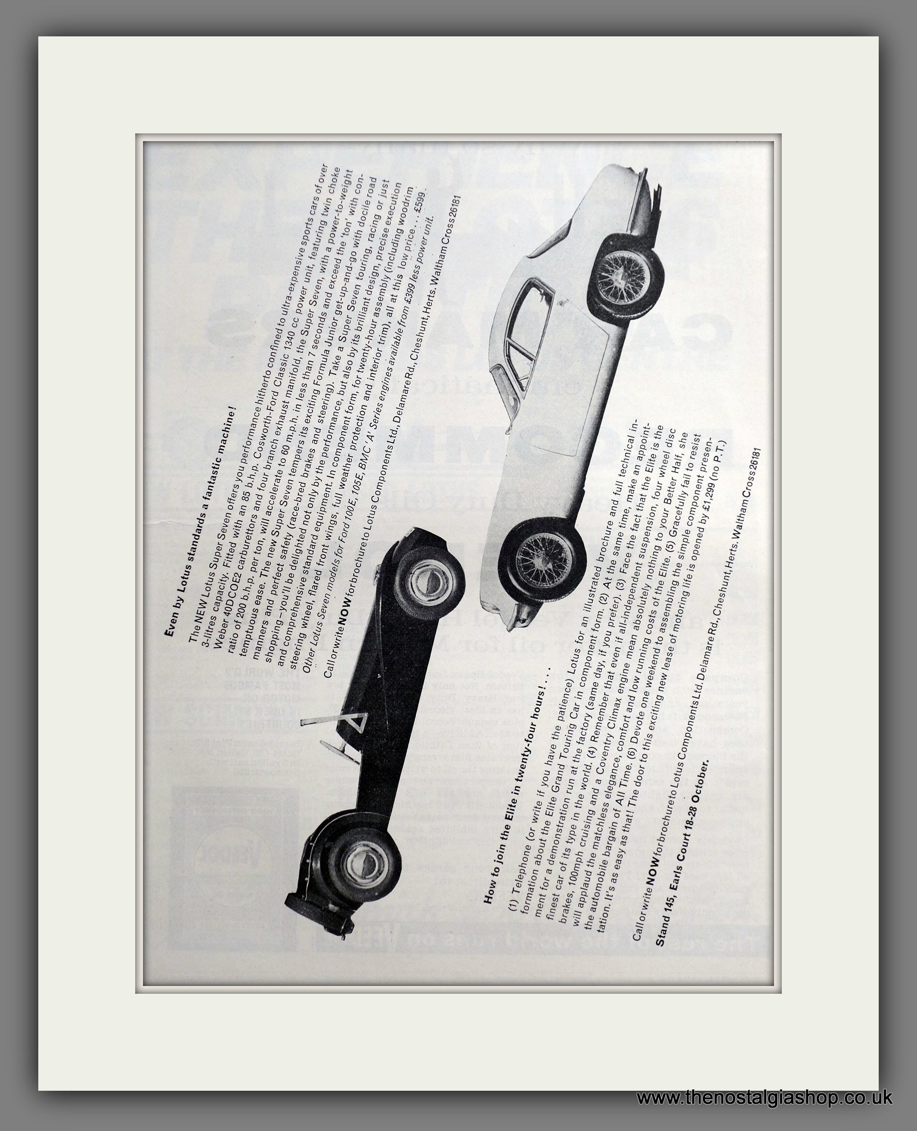 Lotus Cars. Original Advert 1961. Presented and Supplied in a 14 x 11 Inch, cream bevel cut mount with backing card and clear bag. Ready to frame. All our adverts, unless clearly stated are Originals from the date shown They make excellent pieces of wall art and stunning gifts. Many are rare and hard to find and once sold, may not be replaced. Remember you are buying a piece of history. Website watermark is not on original. Lotus Cars Limited.