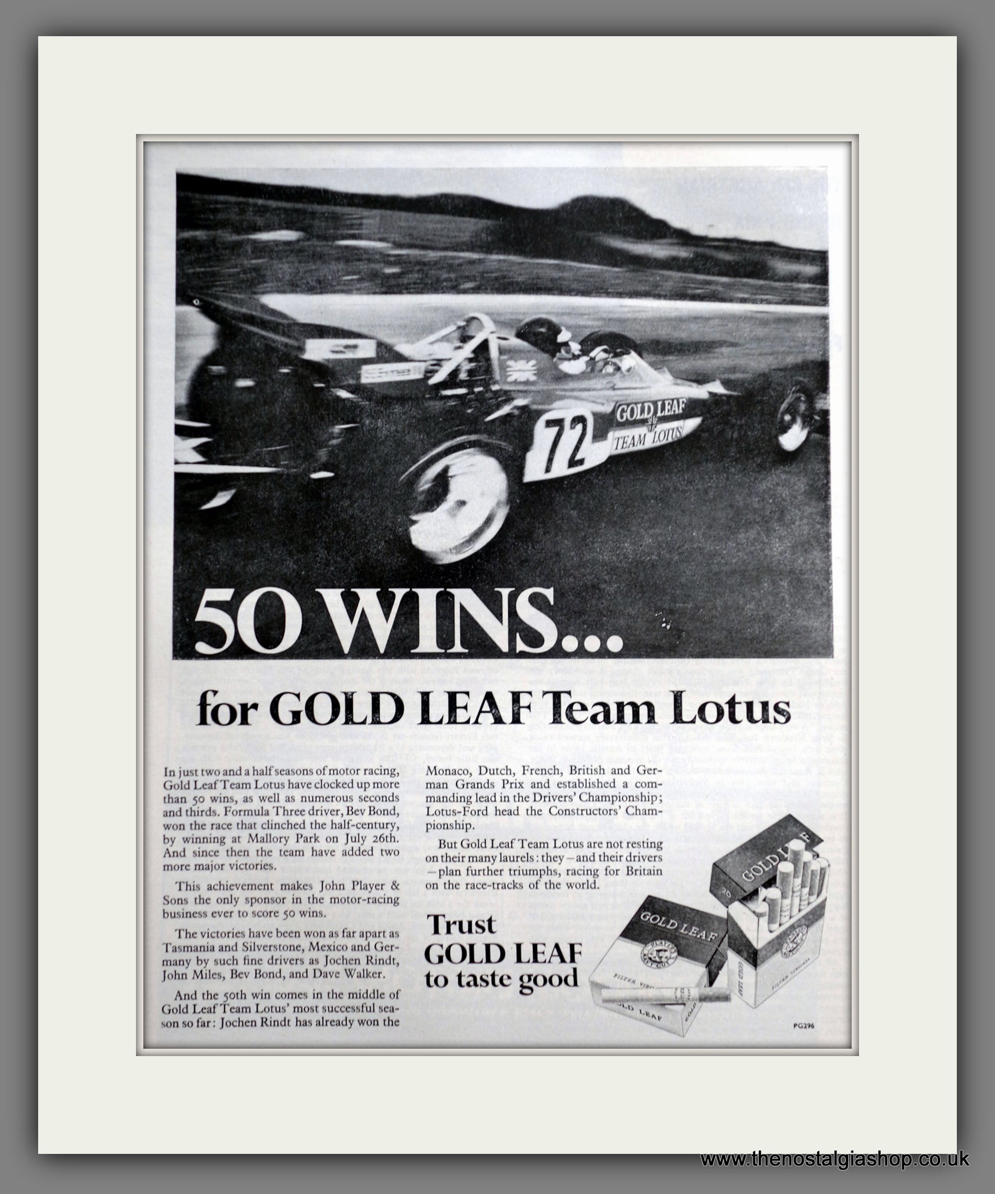 Lotus Cars. Gold Leaf Cigs Original Advert 1970. Presented and Supplied in a 14 x 11 Inch, cream bevel cut mount with backing card and clear bag. Ready to frame. All our adverts, unless clearly stated are Originals from the date shown They make excellent pieces of wall art and stunning gifts. Many are rare and hard to find and once sold, may not be replaced. Remember you are buying a piece of history. Website watermark is not on original. Lotus Cars Limited.