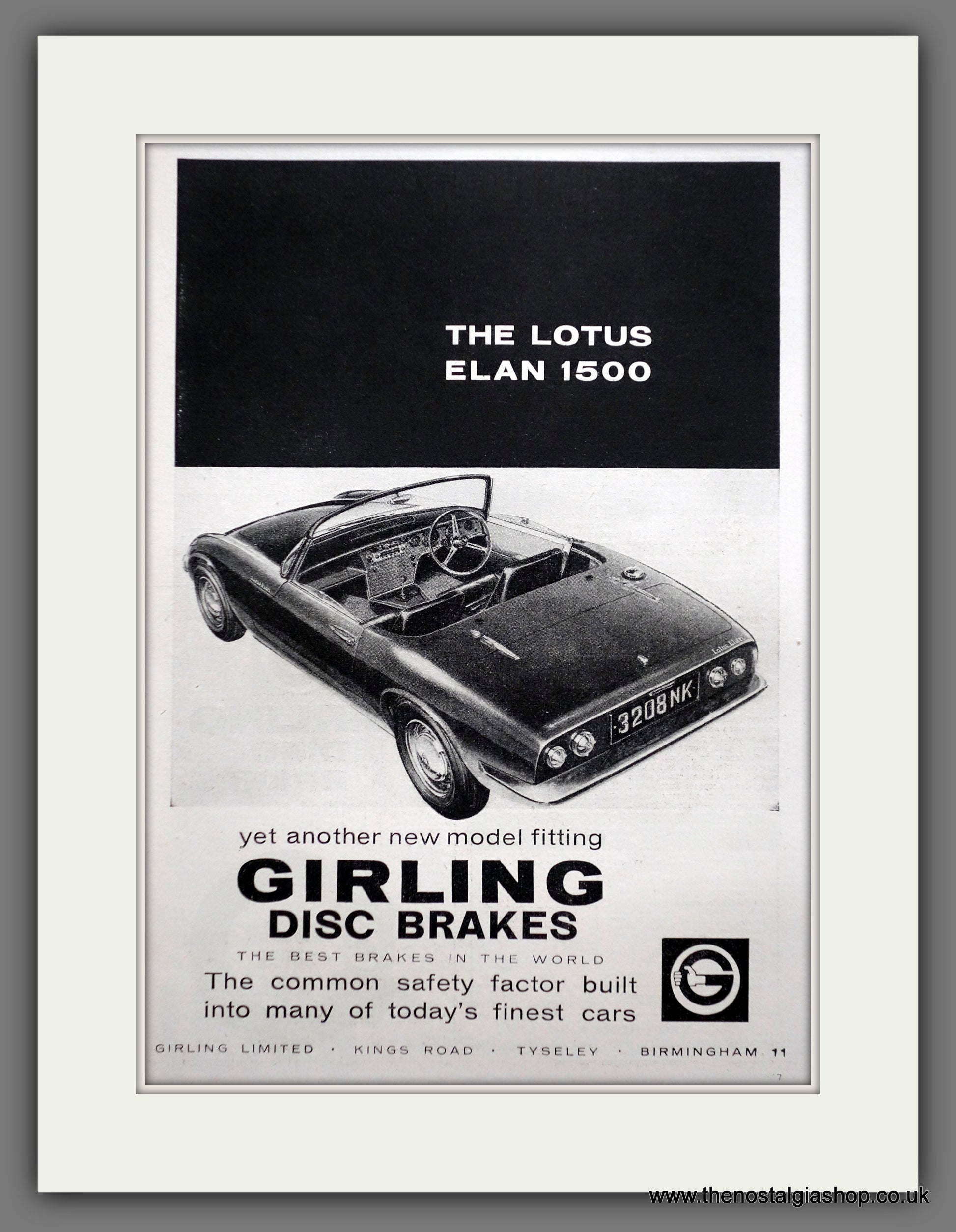Lotus Elan. Original Advert 1962. Presented and Supplied in a 14 x 11 Inch, cream bevel cut mount with backing card and clear bag. Ready to frame. All our adverts, unless clearly stated are Originals from the date shown They make excellent pieces of wall art and stunning gifts. Many are rare and hard to find and once sold, may not be replaced. Remember you are buying a piece of history. Website watermark is not on original. Lotus Cars Limited.
