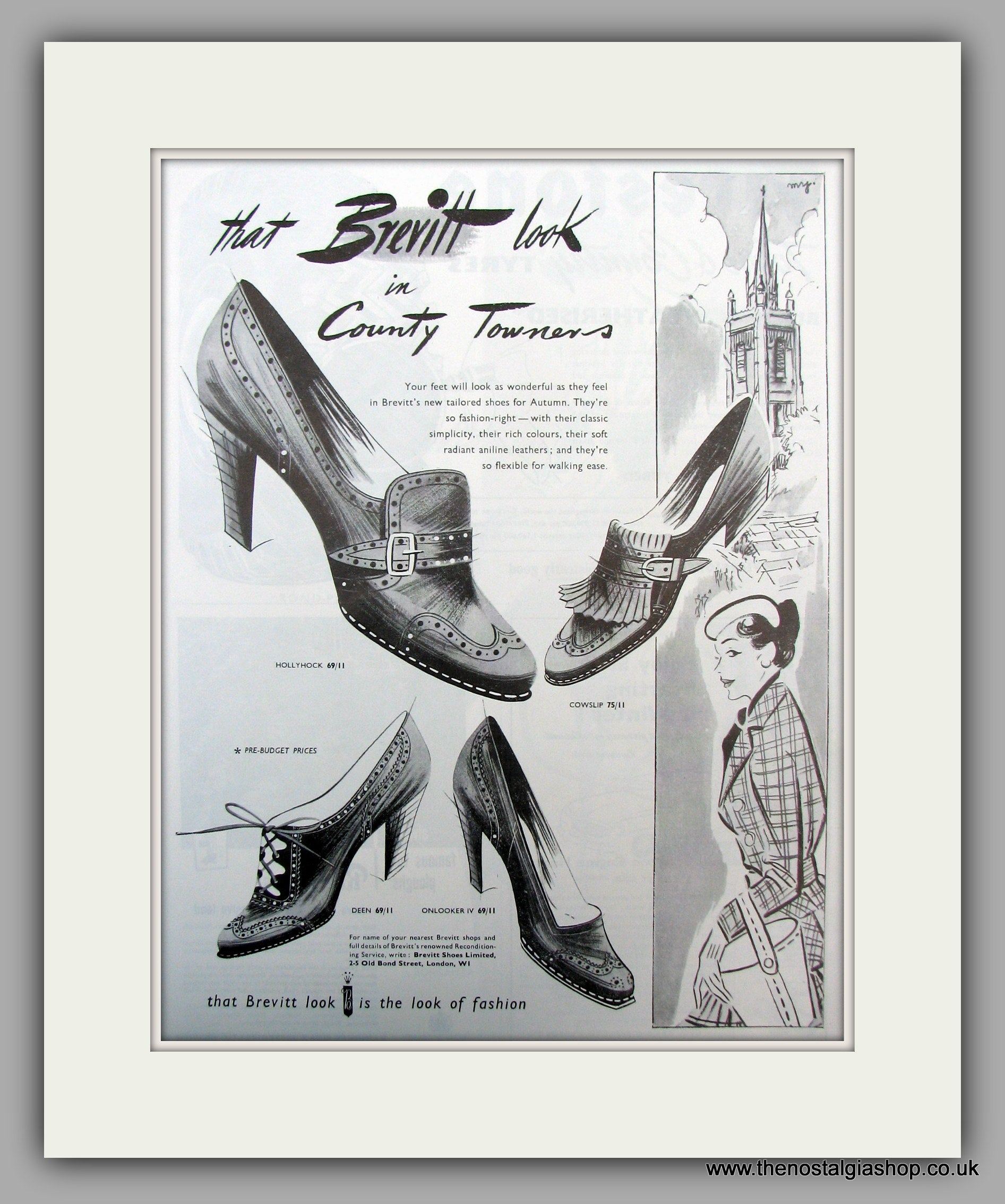 Brevitt Shoes. Vintage Advert. Original advert from 1955. Presented in creme bevel cut mount with backing board and clear bag. Size of the Mount is 18 x 14 Inches. The perfect gift.- These adverts are all taken from Original publications of the dates stated. They are NOT modern reprints. Many are difficult to get hold of ,some are very rare and once sold may not be replaced, Remember, you are buying a piece of historic nostalgia. Lots more adverts available. Please contact us if you don't see the advert you want.