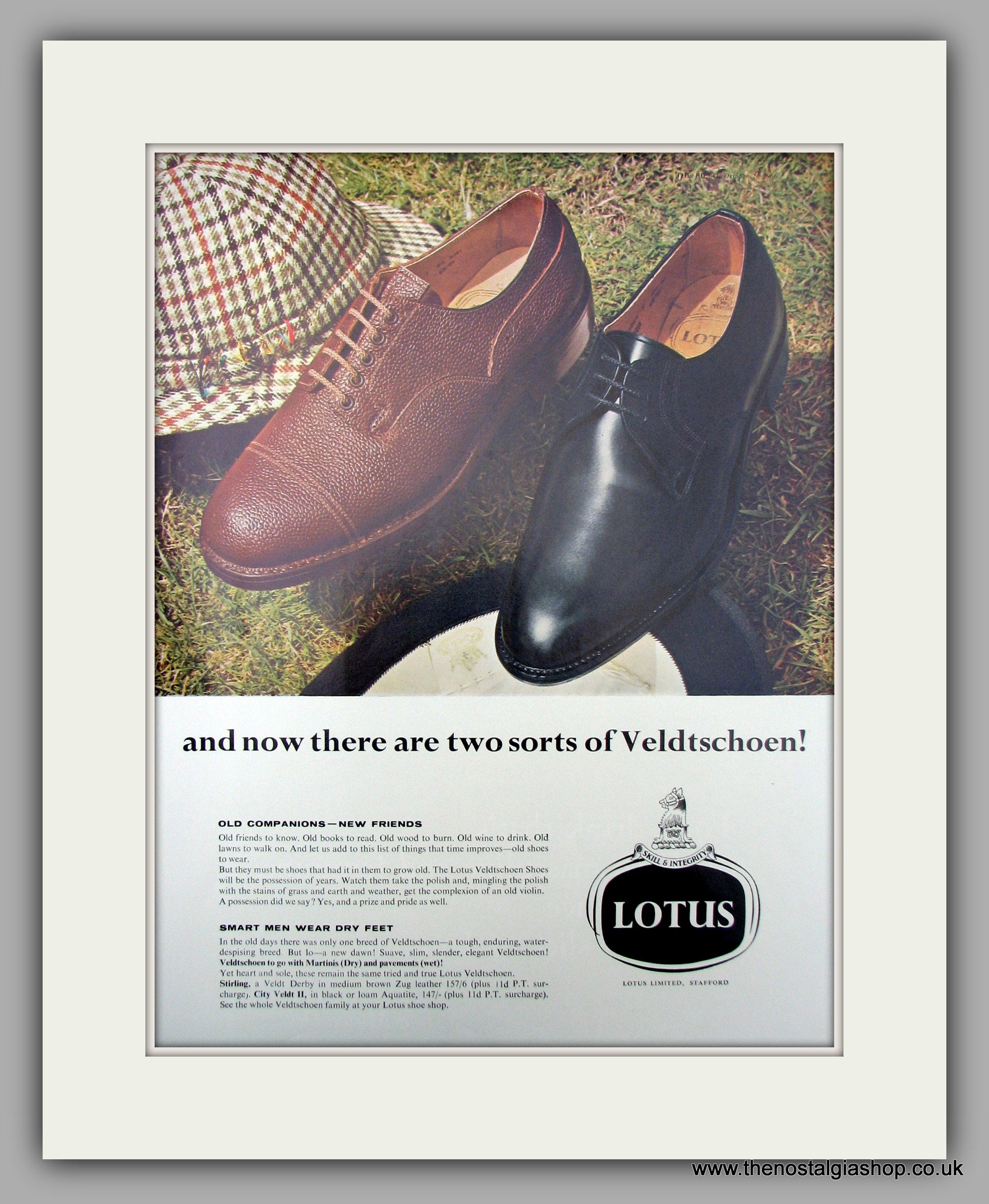Lotus Veldtschoen Shoes. Vintage Advert. Original advert from 1966. Presented in cream bevel cut mount with backing board and clear bag. Size of the Mount is 18 x 14 Inches. The perfect gift.- These adverts are all taken from Original publications of the dates stated. They are NOT modern reprints. Many are difficult to get hold of ,some are very rare and once sold may not be replaced, Remember, you are buying a piece of historic nostalgia. Lots more adverts available. Please contact us if you don't see the advert you want.