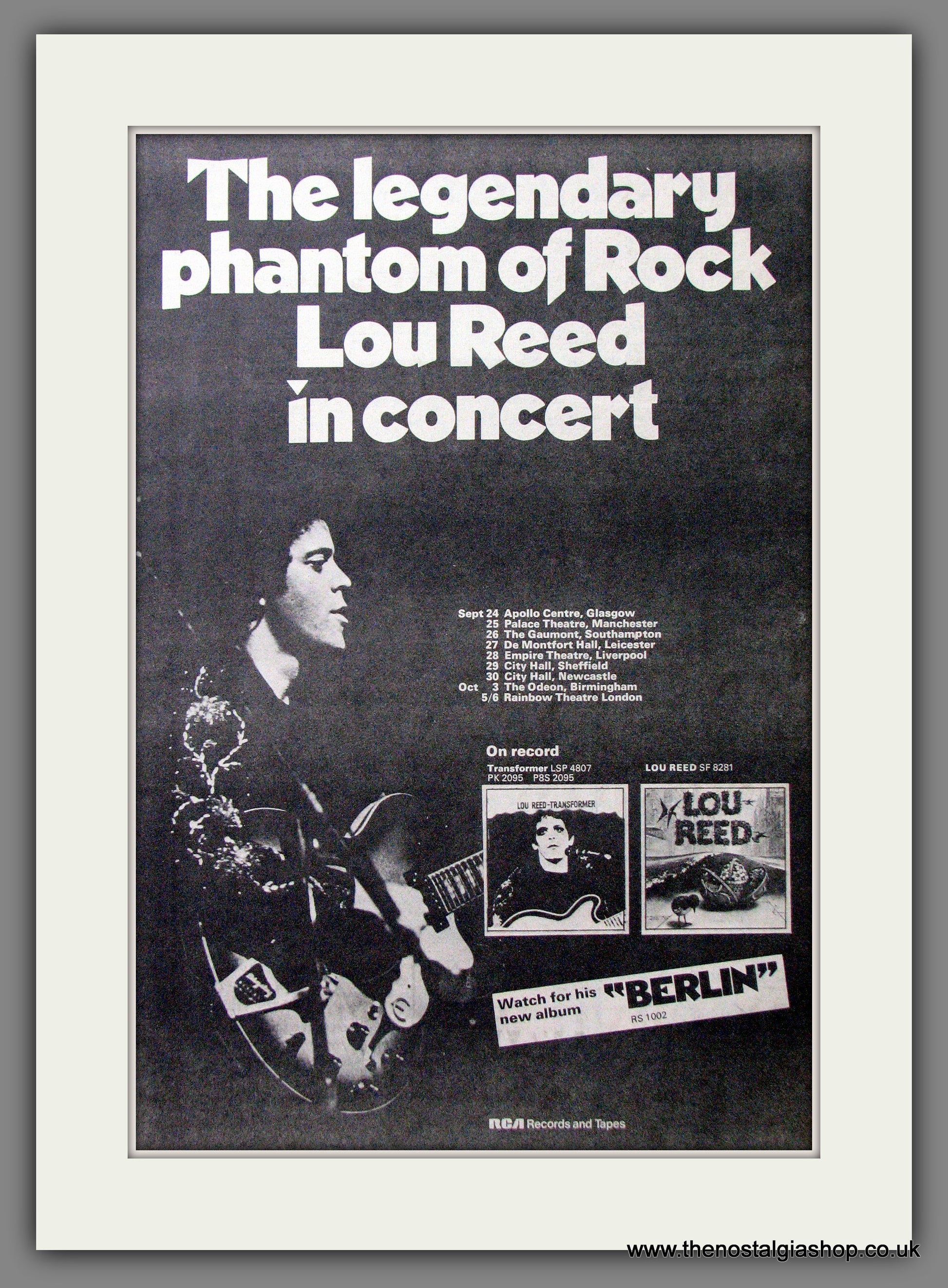 Lou Reed In Concert. This is a large Original Vintage Advert 1973. Presented and Supplied in a cream, bevel cut mount with backing card and clear bag. Ready to fit in 20 x 16 inch frame. The mounted advert will be posted via courier and well packed - protected with a sheet of hardboard to keep it rigid. Any questions or inquiries, please get in touch, we are here to help! All our adverts, unless clearly stated are Originals from the date shown. They make excellent pieces of wall art and stunning gifts. Many are rare and hard to find and once sold, may not be replaced. Remember you are buying a piece of history. Website watermark is not on original.