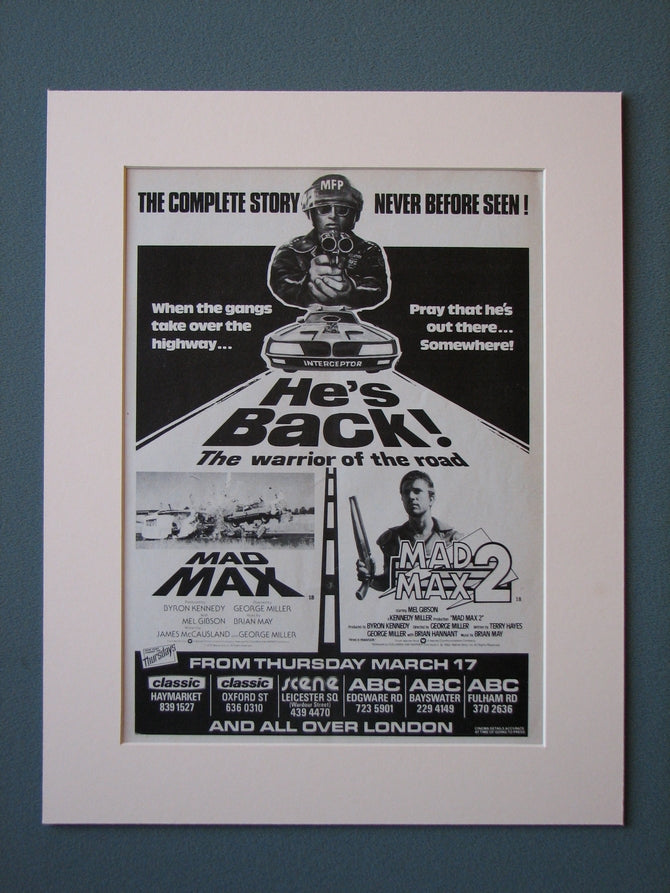 Mad Max I and Mad Max II. Mel Gibson. Original advert 1983 Professionally sealed and presented in cream bevel cut mount with backing card. Ready to fit in 14 x 11 inch frame. Want it framing? buy this then go to Frames Available Category click to buy on the suitable frame and we will do the rest All our adverts unless clearly stated are Originals from the date shown They make excellent pieces of wall art and stunning gifts Many are rare and hard to find and once sold, may not be replaced. Remember you are buying a piece of history