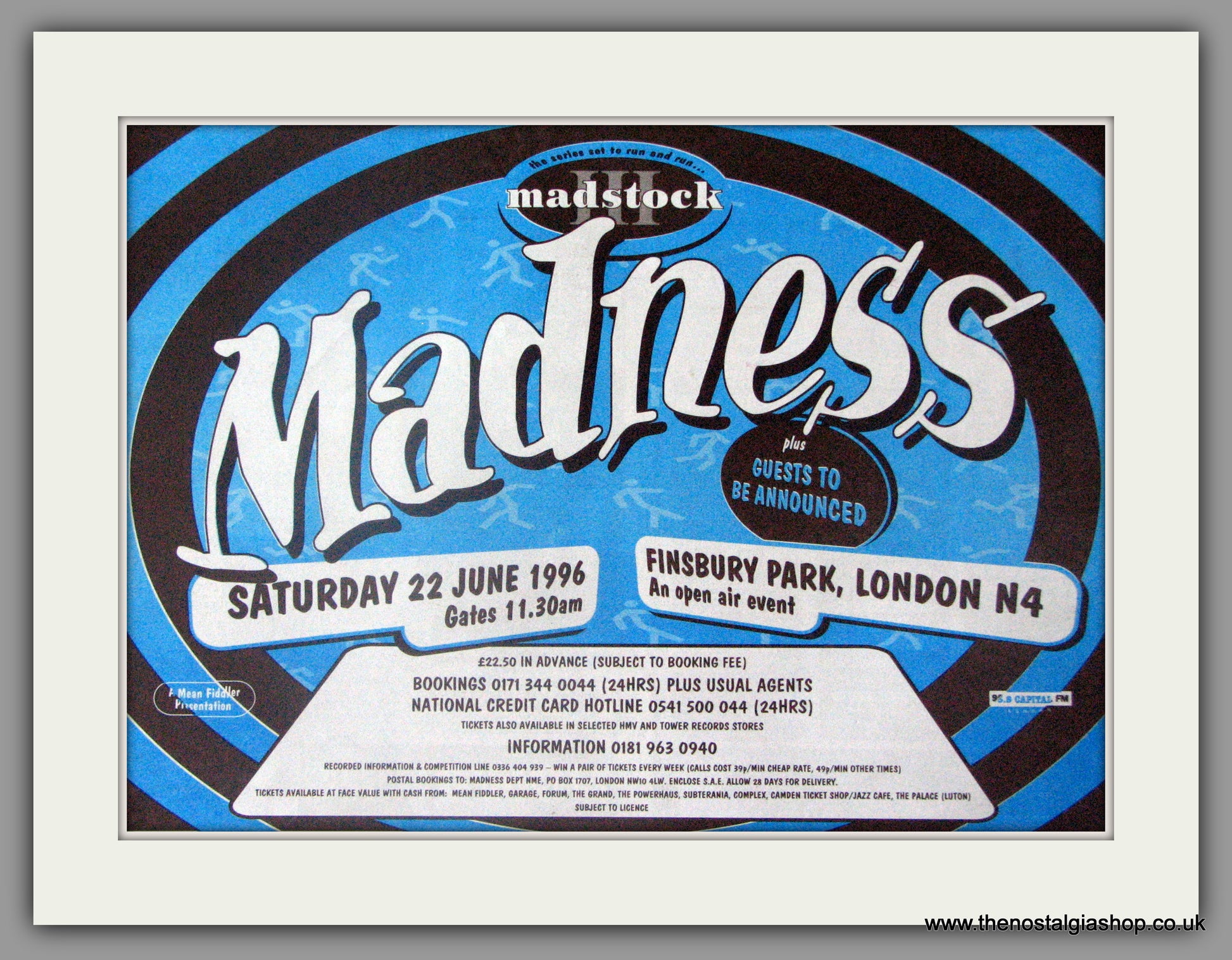 Madstock at Finsbury Park 22nd June 1996. Vintage Advert. Classic original advert 1996. Presented in cream bevel cut mount with backing card and display bag. Ready to fit in 14 x 11 inch frame. Want it framing? If so, buy this then go to Frames Available Category. Click to buy on the suitable frame and we will do the rest. All our adverts, unless clearly stated are Originals from the date shown. They make excellent pieces of wall art and stunning gifts. Many are rare and hard to find and once sold, may not be replaced. Remember you are buying a piece of history. Website watermark is not on original.