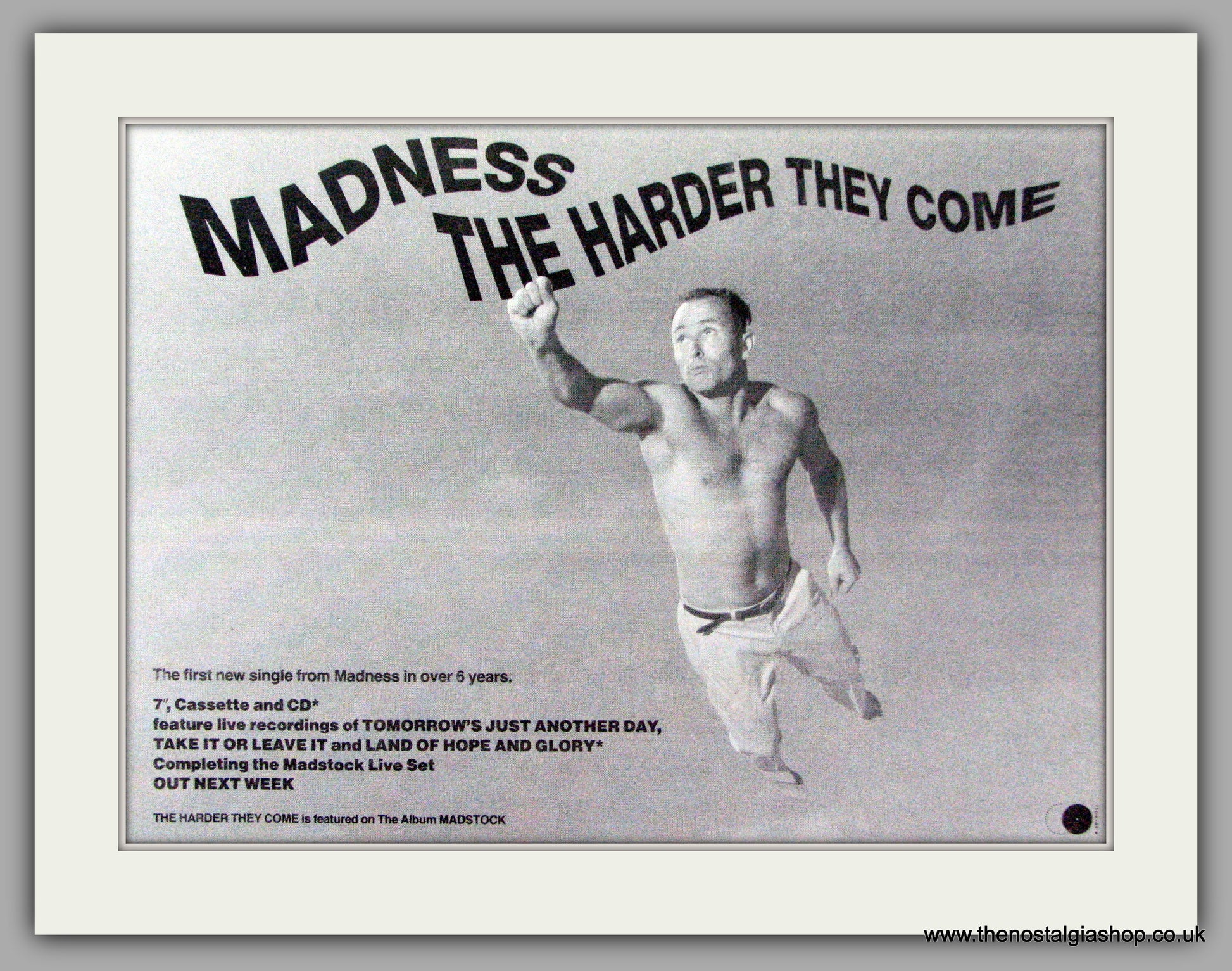Madness. The Harder They Come. Vintage Advert. Classic original advert 1992. Presented in cream bevel cut mount with backing card and display bag. Ready to fit in 14 x 11 inch frame. Want it framing? If so, buy this then go to Frames Available Category. Click to buy on the suitable frame and we will do the rest. All our adverts, unless clearly stated are Originals from the date shown. They make excellent pieces of wall art and stunning gifts. Many are rare and hard to find and once sold, may not be replaced. Remember you are buying a piece of history. Website watermark is not on original.