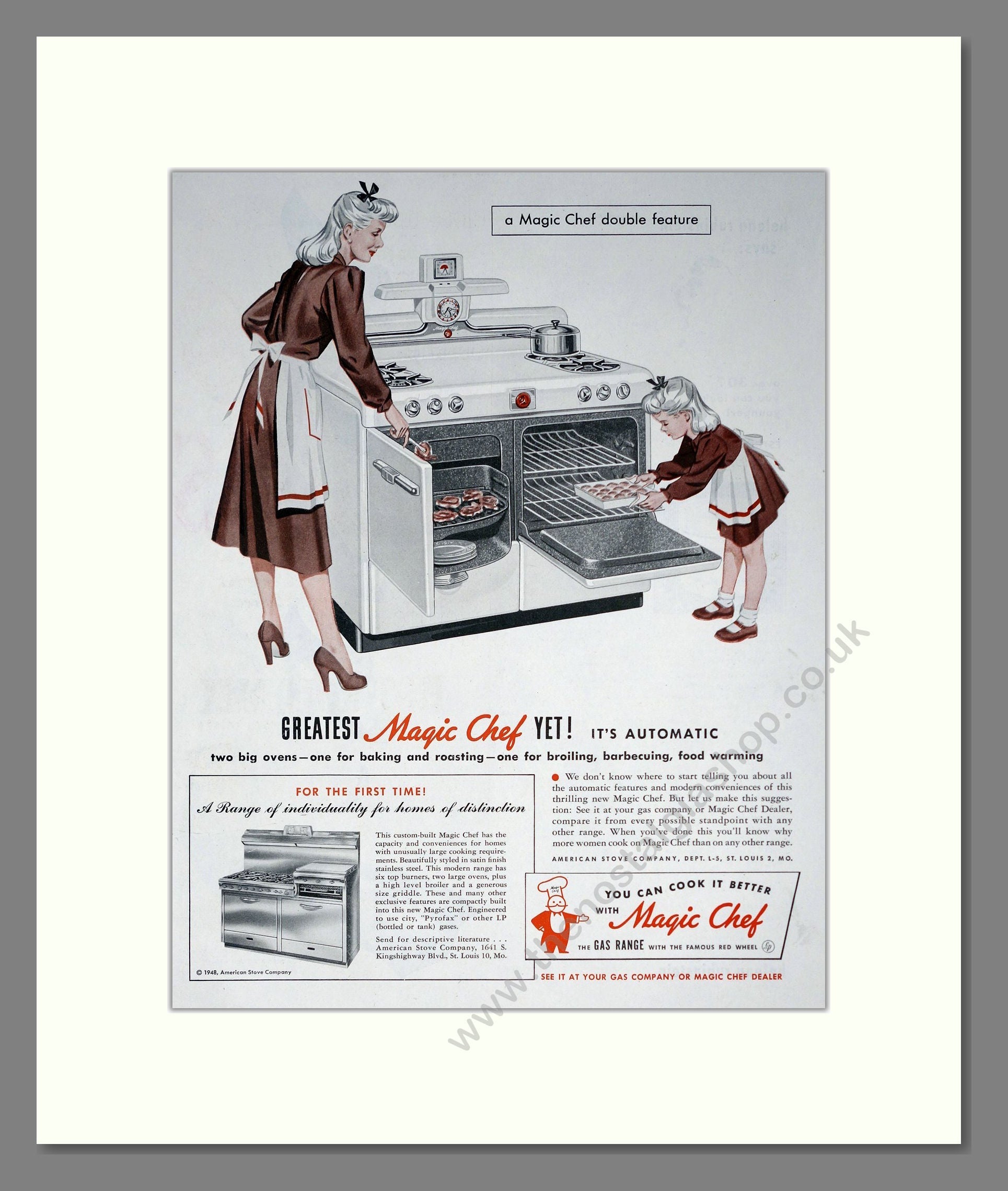 Magic Chef - Range Cooker. Vintage Advert. This is a large classic original advert from 1948. Presented and supplied in a cream bevel cut mount with backing card and clear bag. Ready to fit in a 18 x 14 inches frame. The mounted advert will be posted via courier and well packed - protected with a sheet of hardboard to keep it rigid. Any questions or enquiries, please get in touch, we are here to help! All our adverts, unless clearly stated are originals from the date shown. They make excellent pieces of wall art and stunning gifts. Many are rare and hard to find and once sold, may not be replaced. Remember you are buying a piece of history. Website watermark is not on original.