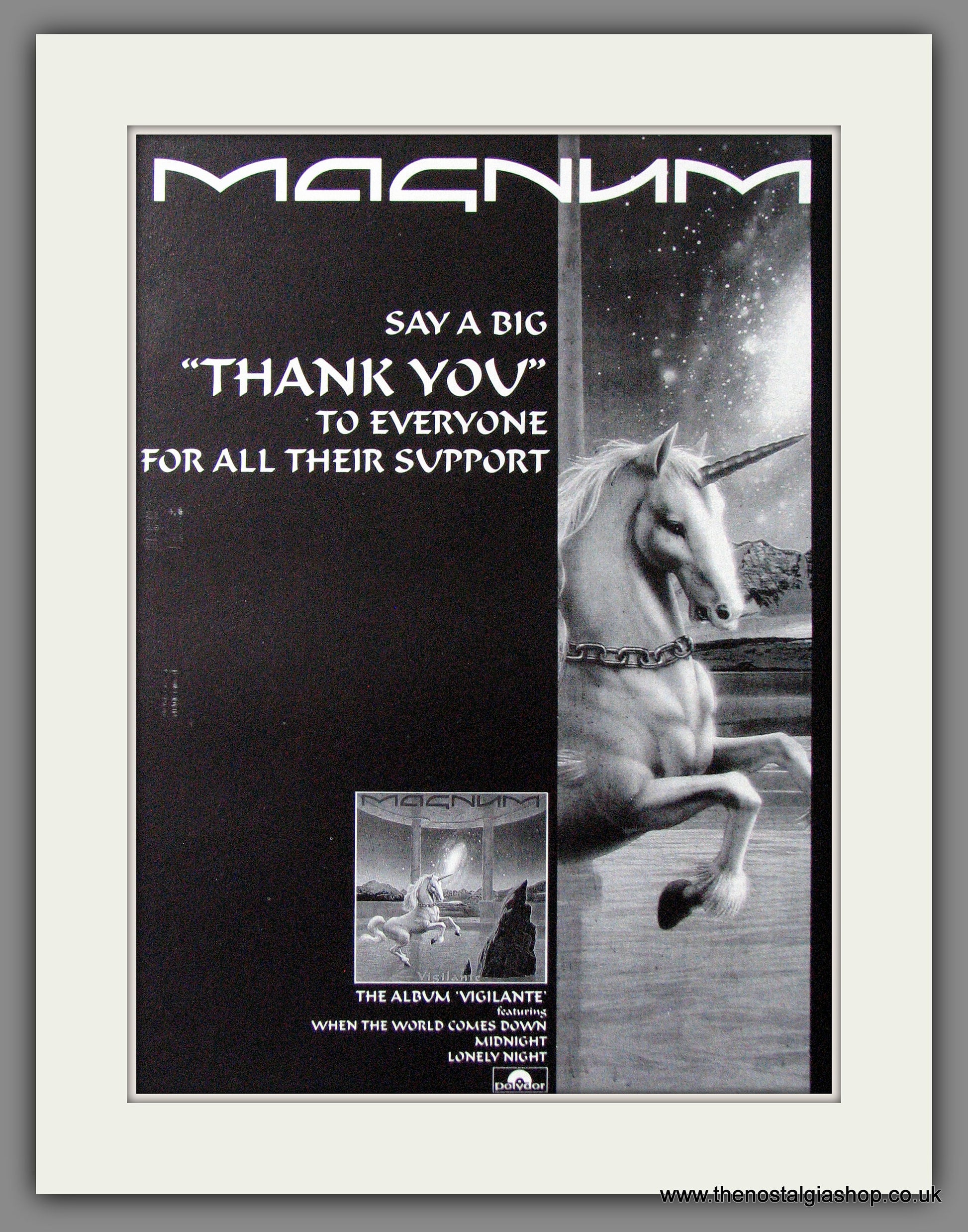 Magnum. Vigilante and a Big Thank You. Classic Original advert 1987. Presented and Supplied in cream bevel cut mount with backing card and clear bag. Ready to fit in 14 x 11 inch frame. Want it framing? If so, buy this then go to Frames Available Category. Click to buy on the suitable frame and we will do the rest. All our adverts, unless clearly stated are Originals from the date shown. They make excellent pieces of wall art and stunning gifts. Many are rare and hard to find and once sold, may not be replaced. Remember you are buying a piece of history. Website watermark is not on original. Bob Catley, Tony Clarkin, Mark Stanway, Dennis Ward, Lee Morris, Kex Gorin, Gary James, Bob Doyle. Colin Wally Lowe.