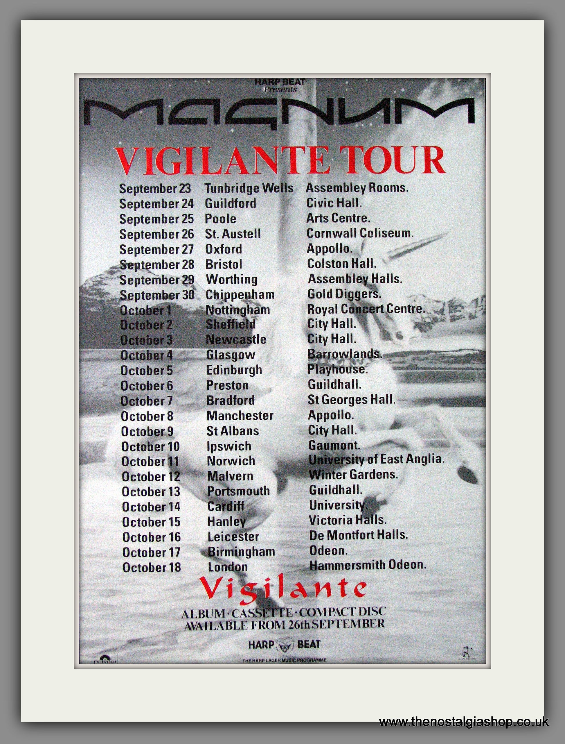 Magnum. Vigilante Tour. Classic Original advert 1986. Presented and Supplied in cream bevel cut mount with backing card and clear bag. Ready to fit in 14 x 11 inch frame. Want it framing? If so, buy this then go to Frames Available Category. Click to buy on the suitable frame and we will do the rest. All our adverts, unless clearly stated are Originals from the date shown. They make excellent pieces of wall art and stunning gifts. Many are rare and hard to find and once sold, may not be replaced. Remember you are buying a piece of history. Website watermark is not on original. Bob Catley, Tony Clarkin, Mark Stanway, Dennis Ward, Lee Morris, Kex Gorin, Gary James, Bob Doyle. Colin Wally Lowe.
