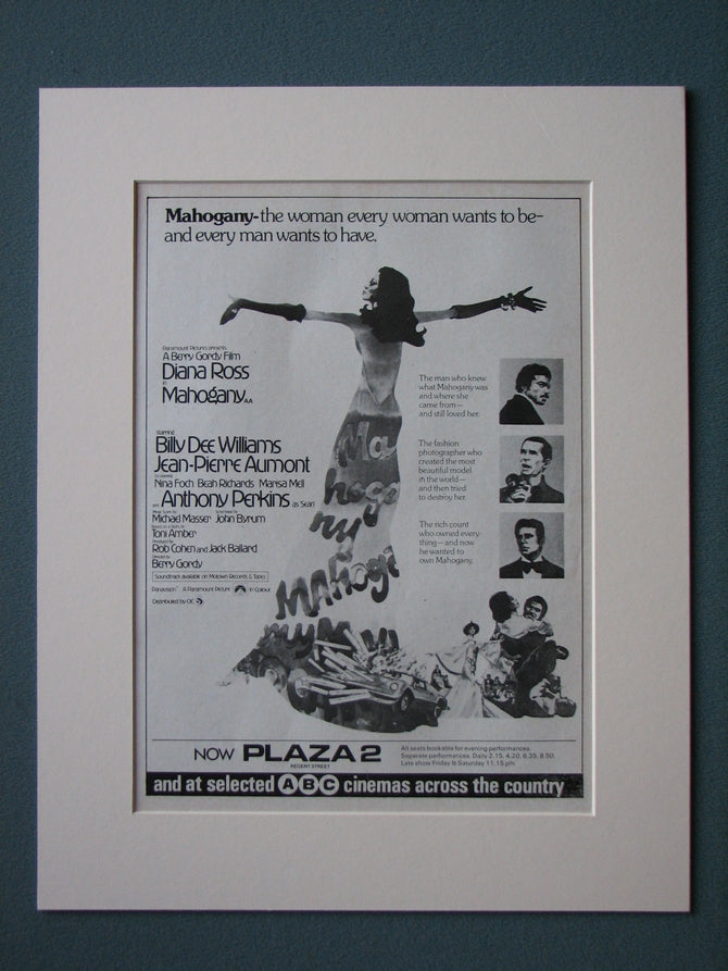 Mahogany. Diana Ross, Billy Dee Williams, Nina Foch. Original advert 1976. Presented and Supplied in cream bevel cut mount with backing card. Ready to fit in 14 x 11 inch frame. Want it framing? If so, buy this then go to Frames Available Category. Click to buy on the suitable frame and we will do the rest. All our adverts, unless clearly stated are Originals from the date shown. They make excellent pieces of wall art and stunning gifts. Many are rare and hard to find and once sold, may not be replaced. Remember you are buying a piece of history. The Supremes.