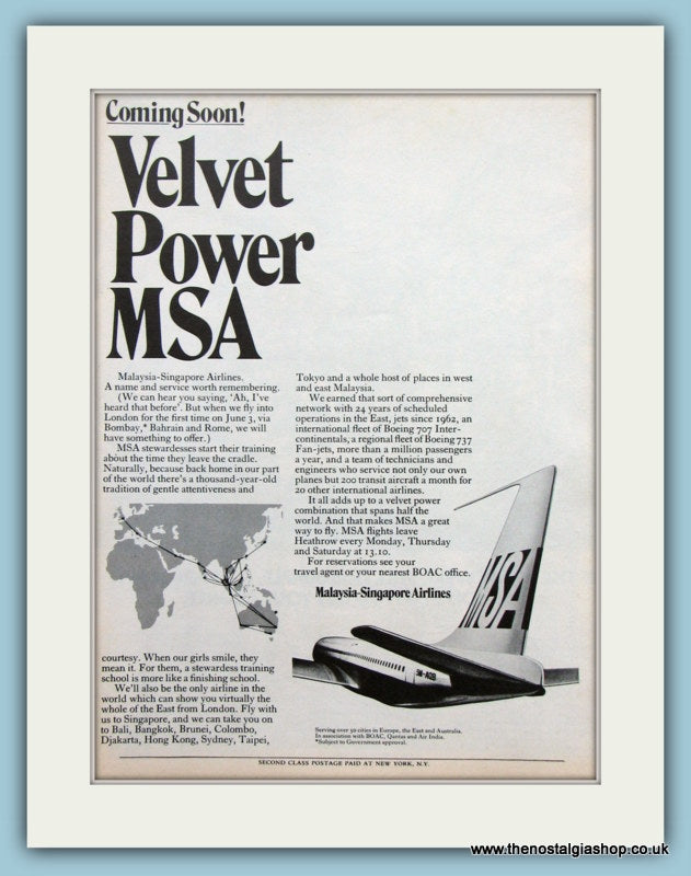 Malaysia-Singapore Airlines. Coming soon velvet power MSA. Classic original advert 1971. Professionally sealed and presented in cream bevel cut mount with backing card. Ready to fit in 14 x 11 inch frame. Want it framing? If so, buy this then go to Frames Available Catagory. Click to buy on the suitable frame and we will do the rest. All our adverts, unless clearly stated are Originals from the date shown. They make excellent pieces of wall art and stunning gifts. Many are rare and hard to find and once sold, may not be replaced. Remember you are buying a piece of history. Website watermark is not on original.