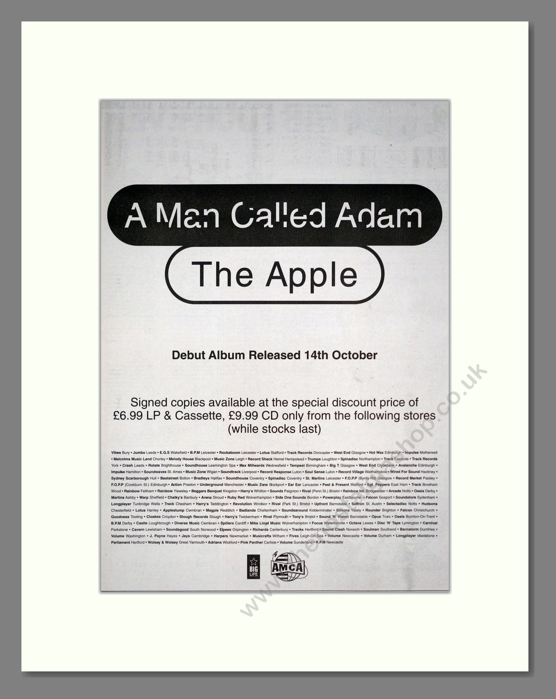 Man Called Adam (A) - The Apple. Vintage Advert. This is a large classic original advert from 1991. Presented and supplied in a cream bevel cut mount with backing card and clear bag. Ready to fit in a 20 x 16 inches frame. The mounted advert will be posted via courier and well packed - protected with a sheet of hardboard to keep it rigid. Any questions or enquiries, please get in touch, we are here to help! All our adverts, unless clearly stated are originals from the date shown. They make excellent pieces of wall art and stunning gifts. Many are rare and hard to find and once sold, may not be replaced. Remember you are buying a piece of history. Website watermark is not on original.