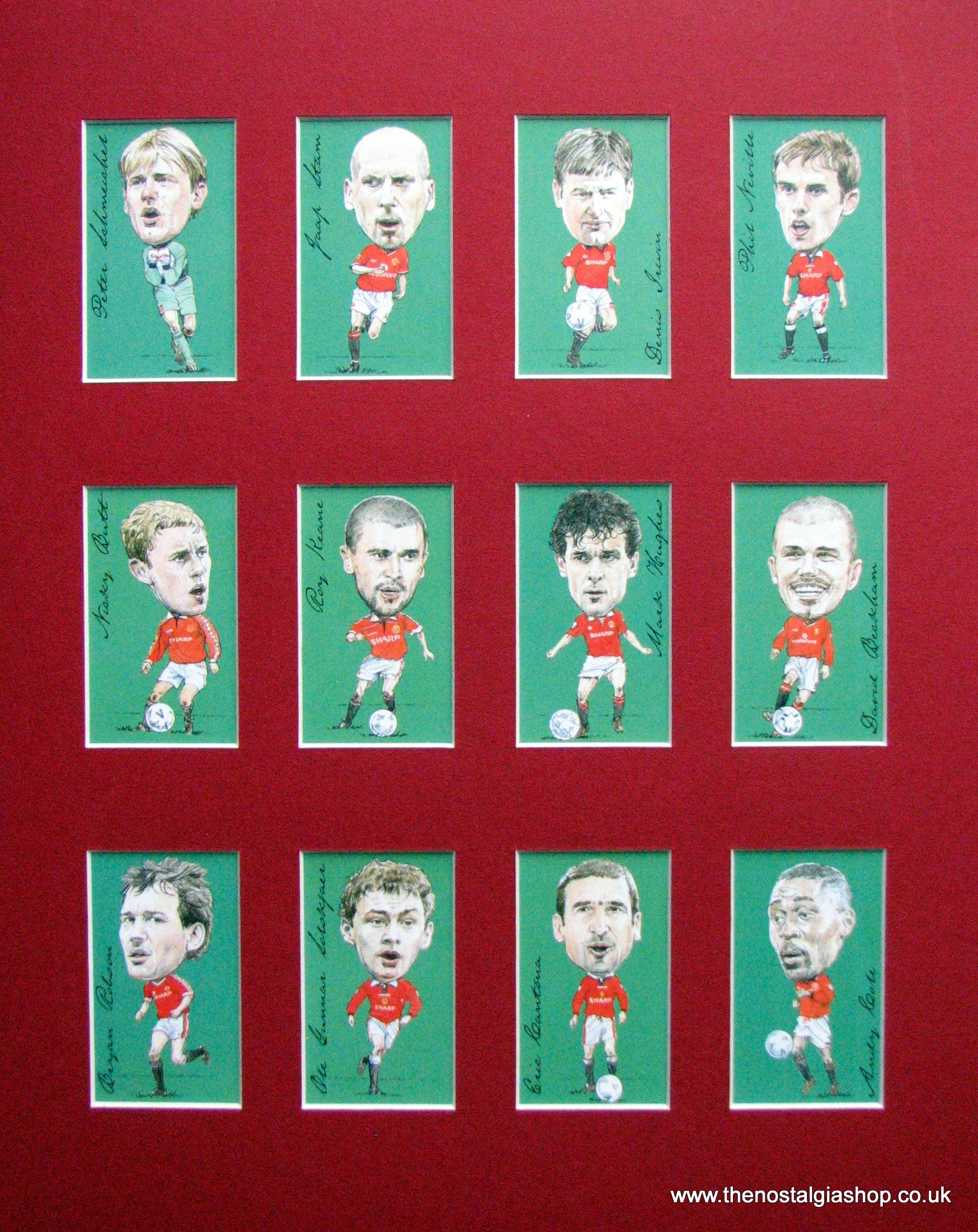 Manchester United Legends. Beautifully illustrated caricatures showing a selection of great players over the years. Presented fixed in Red mount with backing board. Players featured are; Peter Schmeichel, Jaap Stam, Phil Neville, Nicky Butt, Brian Robson, Denis Irwin, Ole Gunnar Solskjaer, Andy Cole, Roy Keane, Mark Hughes, David Beckham, Eric Cantona. Rear of cards not viewable. Made to fit straight into 14 x 11 inch frame. Want It Framing? If so, add this to your basket, then go to the Frames Available Category, Click to add the frame of your choice. We will then assemble and post the set to you. Other teams available. Man Utd.