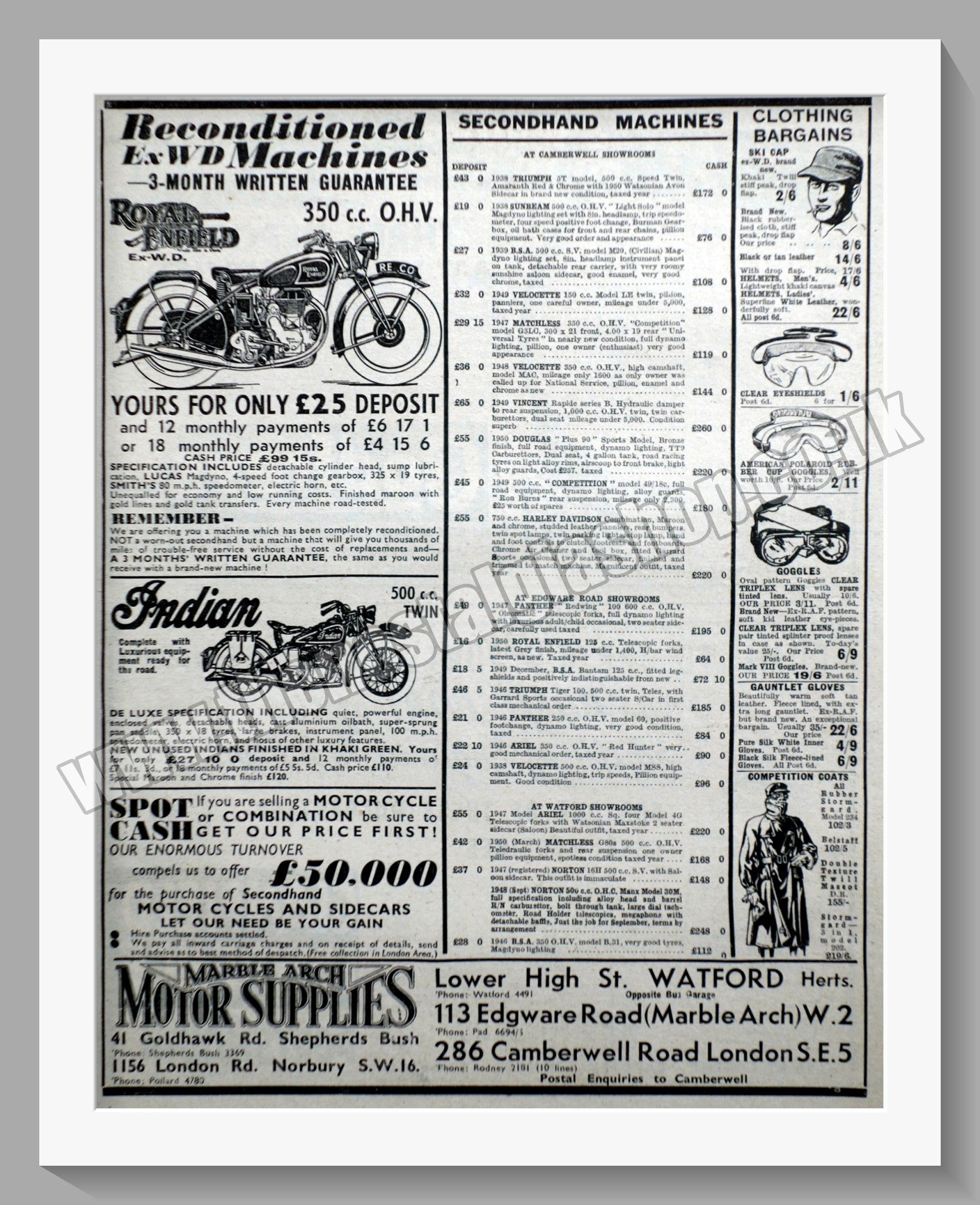 Marble Arch Camberwell Road London Motorcycle Dealerships. Classic Original Advert 1950. Presented and Supplied in a 14 x 11 Inch, cream bevel cut mount with backing card and clear bag. Ready to frame. All our adverts, unless clearly stated are Originals from the date shown They make excellent pieces of wall art and stunning gifts. Many are rare and hard to find and once sold, may not be replaced. Remember you are buying a piece of history. Website watermark is not on original. Vintage Motorcycle Dealerships.