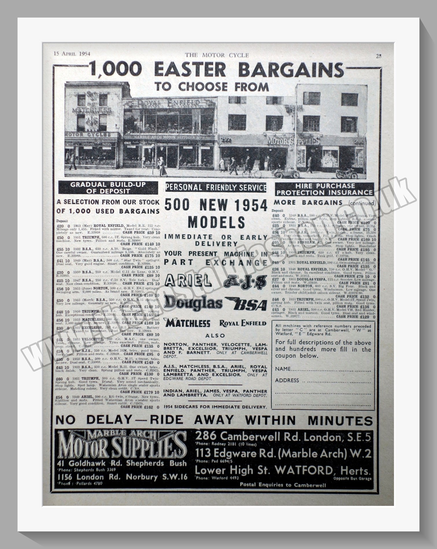 Marble Arch Camberwell Road London Motorcycle Dealerships. Classic Original Advert 1954. Presented and Supplied in a 14 x 11 Inch, cream bevel cut mount with backing card and clear bag. Ready to frame. All our adverts, unless clearly stated are Originals from the date shown They make excellent pieces of wall art and stunning gifts. Many are rare and hard to find and once sold, may not be replaced. Remember you are buying a piece of history. Website watermark is not on original. Vintage Motorcycle Dealerships.