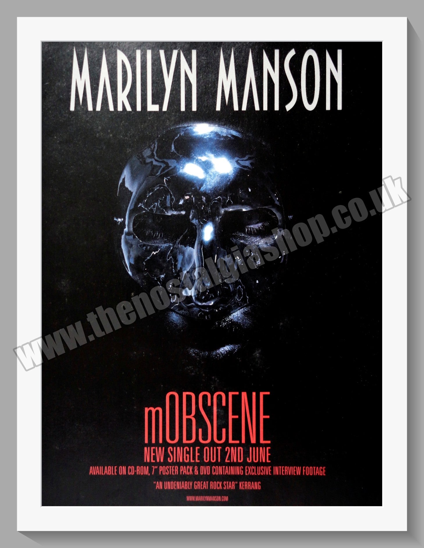 Marilyn Manson Mobscene. Original Vintage advert 2003. Presented in a cream bevel cut mount with backing card and clear bag. Ready to fit in 14 x 11 inch frame. All our adverts, unless clearly stated are Originals from the date shown. They make excellent pieces of wall art and stunning gifts. Many are rare and hard to find and once sold, may not be replaced. Remember you are buying a piece of history. Website watermark is not on original.