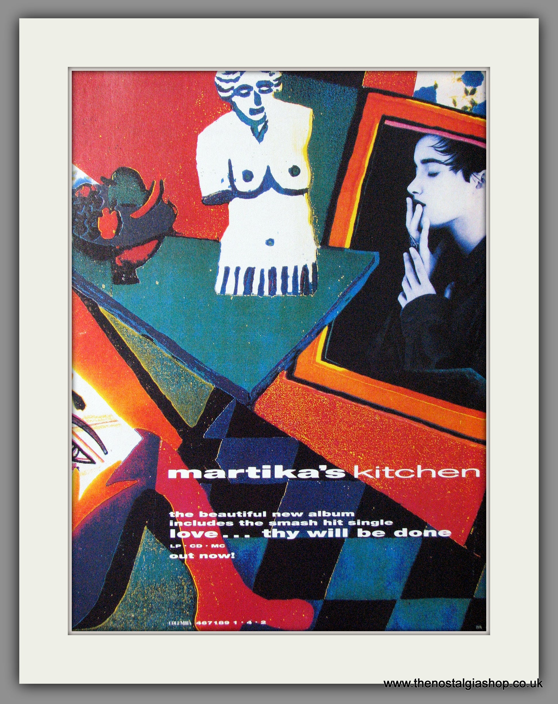 Martika's Kitchen, Love Thy Will Be Done. Classic Original advert 1991. Presented and Supplied in cream bevel cut mount with backing card and clear bag. Ready to fit in 14 x 11 inch frame. Want it framing? If so, buy this then go to Frames Available Category. Click to buy on the suitable frame and we will do the rest. All our adverts, unless clearly stated are Originals from the date shown. They make excellent pieces of wall art and stunning gifts. Many are rare and hard to find and once sold, may not be replaced. Remember you are buying a piece of history. Website watermark is not on original.