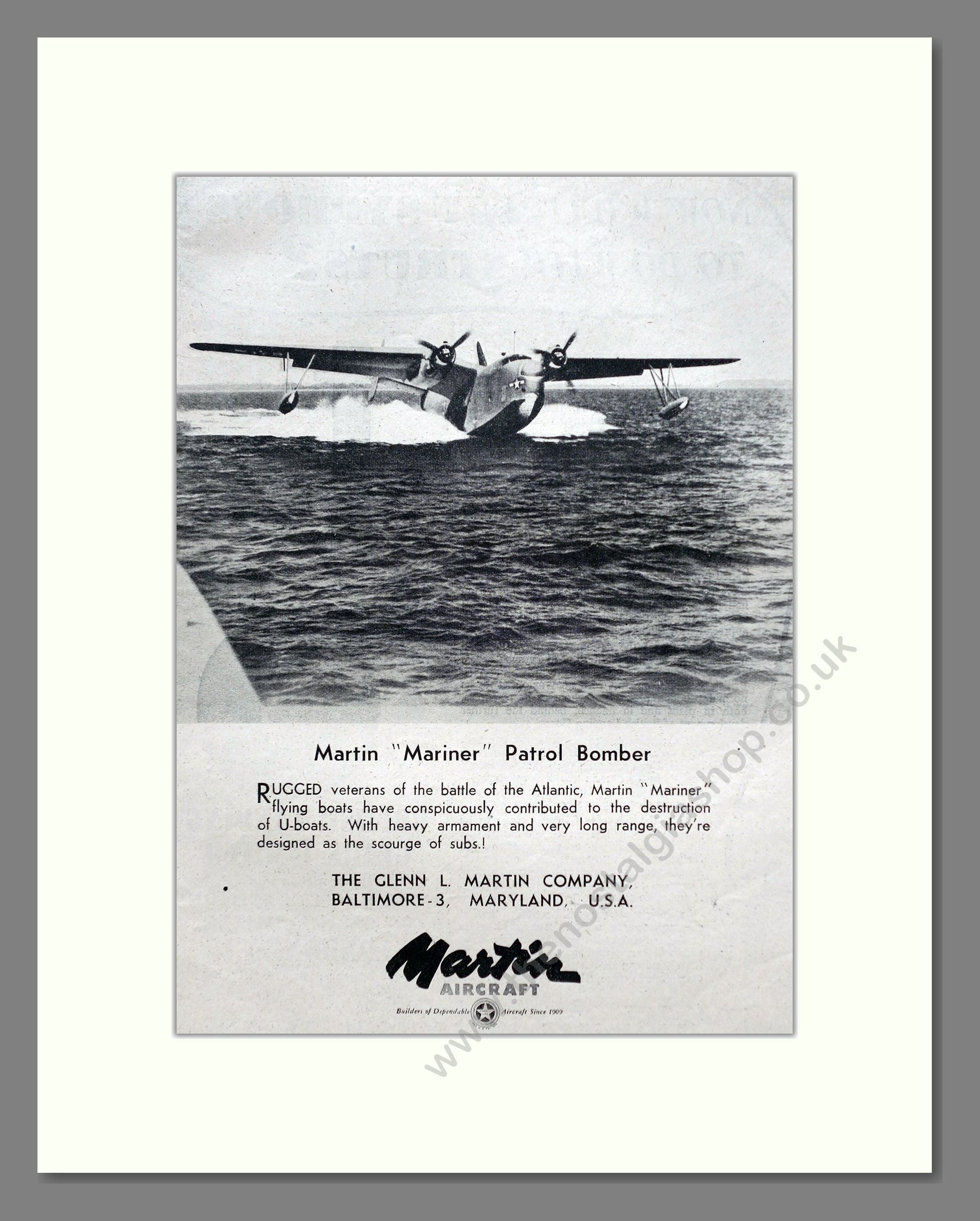 Martin - Mariner Patrol Bomber. Vintage Advert. This is a classic original advert from 1944. Presented and supplied in a cream bevel cut mount with backing card and clear bag. Ready to fit in a 14 x 11 inches frame. The mounted advert will be posted via courier and well packed - protected with a sheet of hardboard to keep it rigid. Any questions or enquiries, please get in touch, we are here to help! All our adverts, unless clearly stated are originals from the date shown. They make excellent pieces of wall art and stunning gifts. Many are rare and hard to find and once sold, may not be replaced. Remember you are buying a piece of history. Website watermark is not on original.