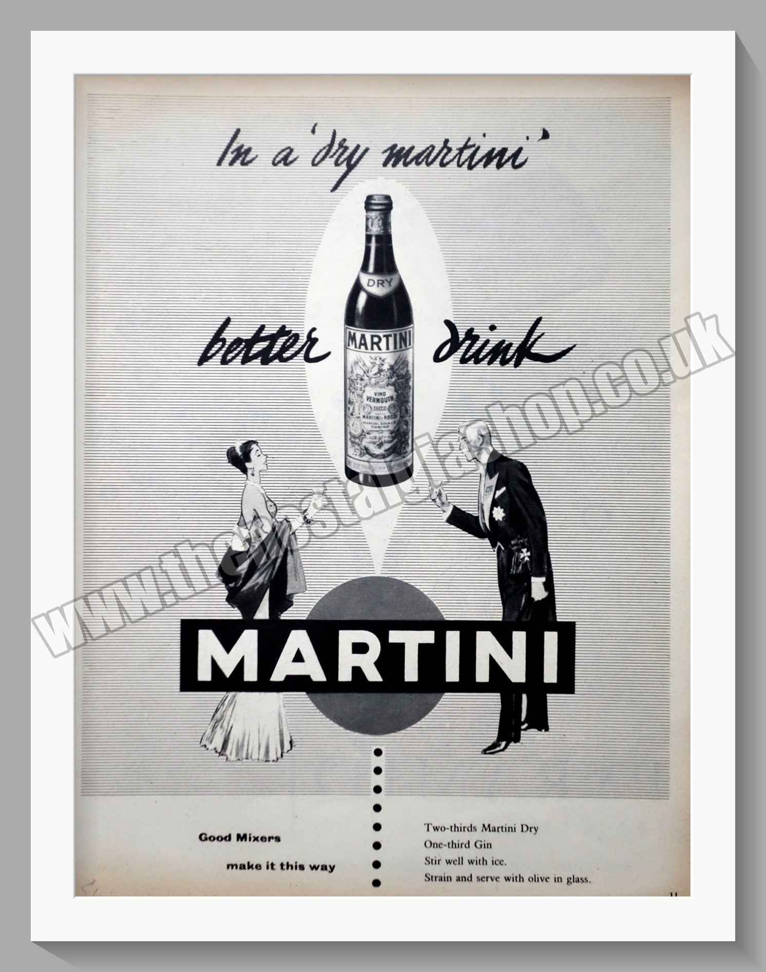 Martini Vermouth. Vintage Advert. This is a large classic Original Advert 1954. Presented and Supplied in a cream bevel cut mount with backing card and clear bag. Ready to fit in 18 x 14 inch frame. The mounted advert will be posted via courier and well packed - protected with a sheet of hardboard to keep it rigid. Any questions or inquiries, please get in touch, we are here to help! All our adverts, unless clearly stated are Originals from the date shown. They make excellent pieces of wall art and stunning gifts. Many are rare and hard to find and once sold, may not be replaced. Remember you are buying a piece of history. Website watermark is not on original. Vintage drink adverts. Drink Adverts.