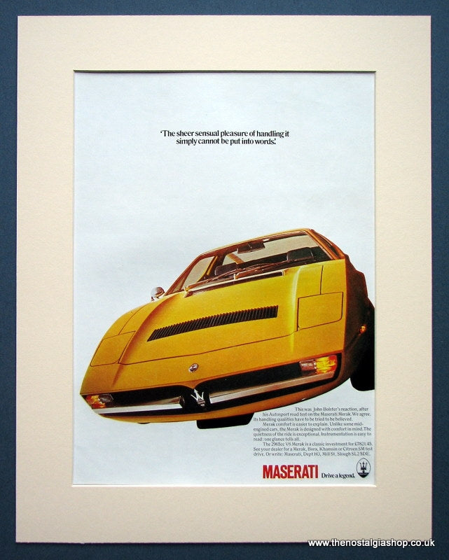 Maserati Merak. The sheer sensual pleasure of handling it simply cannot be put into words' Classic original advert 1975. Presented in cream bevel cut mount with backing card and clear bag. Ready to fit in 14 x 11 inch frame. Want it framing? If so, buy this then go to Frames Available Category. Click to buy on the suitable frame and we will do the rest. All our adverts, unless clearly stated are Originals from the date shown They make excellent pieces of wall art and stunning gifts. Many are rare and hard to find and once sold, may not be replaced. Remember you are buying a piece of history. Website watermark is not on original.