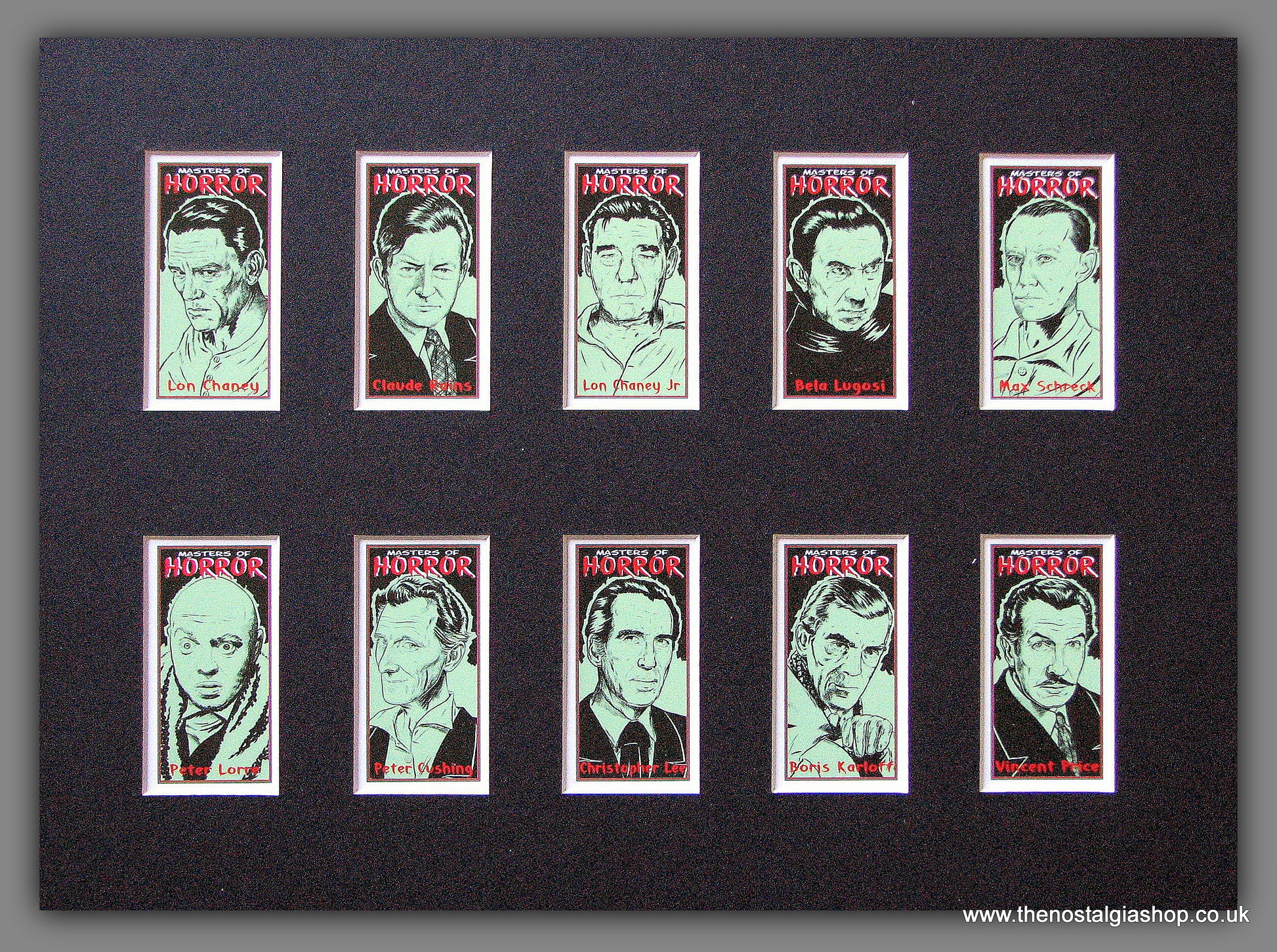 Masters of Horror, Mounted Card Set. Featuring - Lon Chaney, Claud Rains, Lon Chaney Jr, Bela Lugosi, Max Schreck, Peter Lorre, Peter Cushing, Christopher Lee, Boris Karloff, Vincent Price. Presented and Supplied in black bevel cut mount with backing card and clear bag. Ready to fit in 14 x 11 inch frame. Want it framing? If so, buy this then go to Frames Available Category. Click to buy on the suitable frame and we will do the rest. Website watermark is not on original.