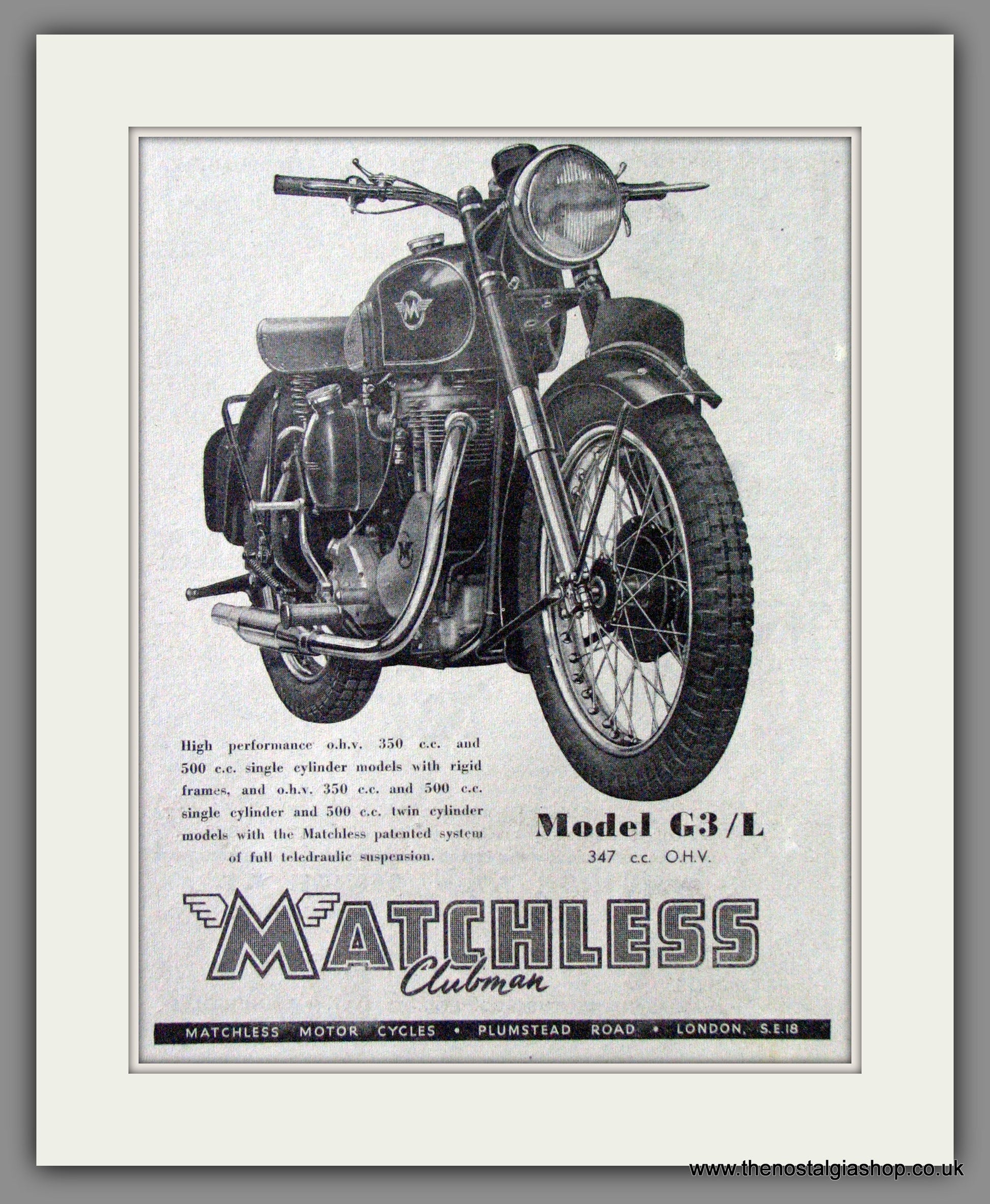 Matchless Motorcycles. Matchless G3/L 350cc. Classic Original Vintage Advert 1952. Presented in cream bevel cut mount with backing card and clear bag. Ready to fit in 14 x 11 inch frame. Want it framing? If so, buy this then go to Frames Available Category. Click to buy on the suitable frame and we will do the rest. All our adverts, unless clearly stated are Originals from the date shown. They make excellent pieces of wall art and stunning gifts. Many are rare and hard to find and once sold, may not be replaced. Remember you are buying a piece of history. Website watermark is not on original.