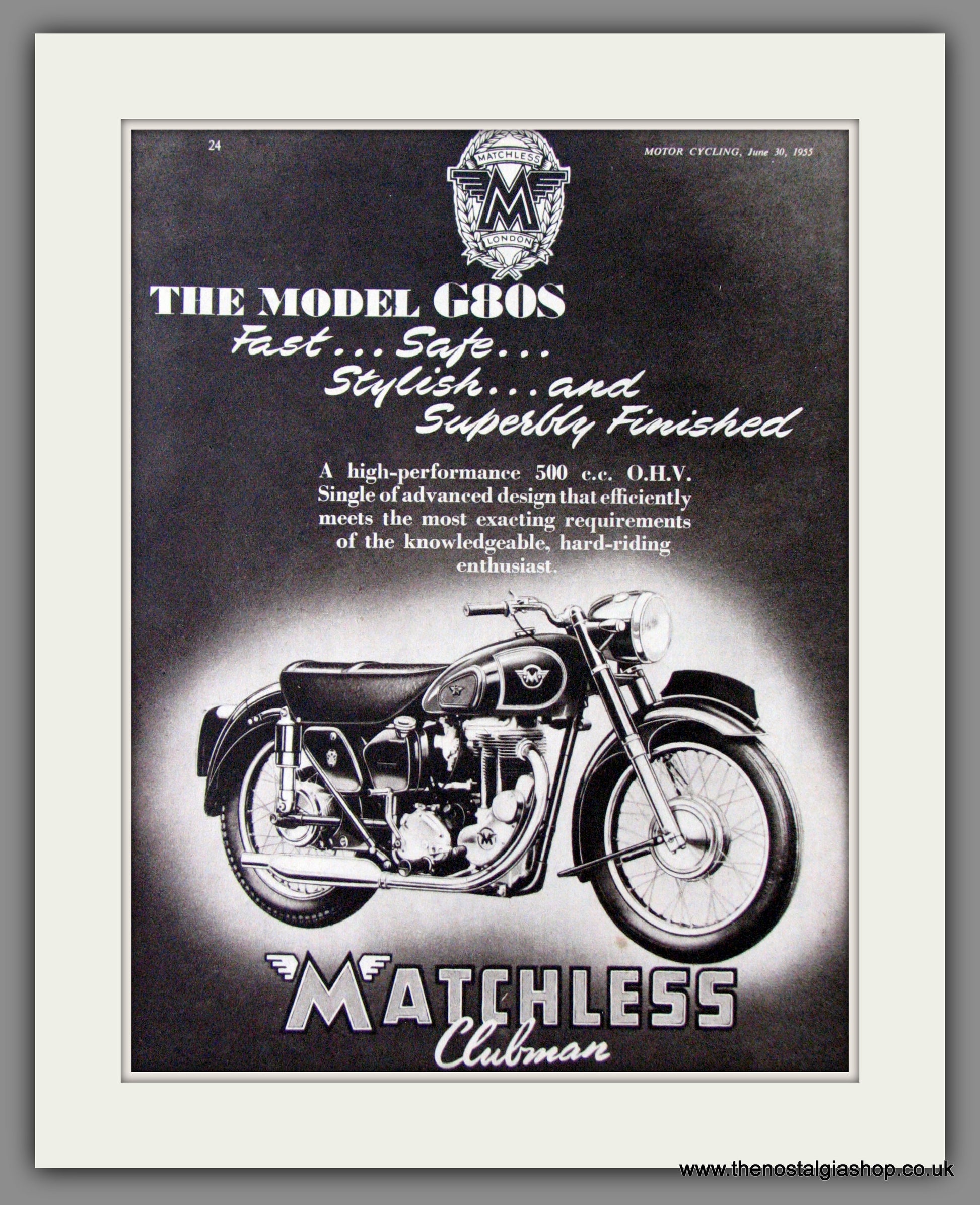 Matchless Motorcycles. Matchless G80S. Classic Original Vintage Advert 1955. Presented in cream bevel cut mount with backing card and clear bag. Ready to fit in 14 x 11 inch frame. Want it framing? If so, buy this then go to Frames Available Category. Click to buy on the suitable frame and we will do the rest. All our adverts, unless clearly stated are Originals from the date shown. They make excellent pieces of wall art and stunning gifts. Many are rare and hard to find and once sold, may not be replaced. Remember you are buying a piece of history. Website watermark is not on original.