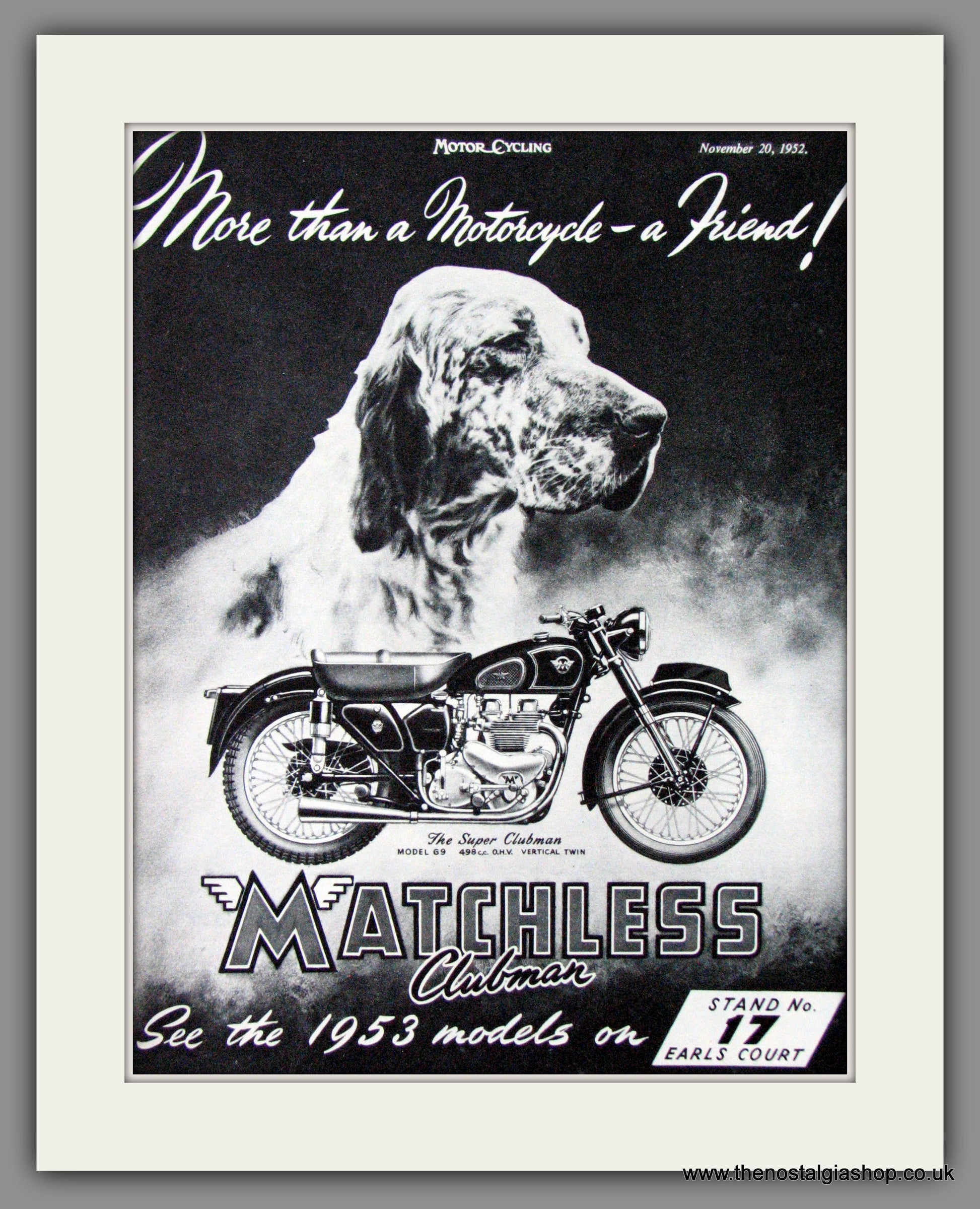 Matchless Motorcycles. Matchless Super Clubman Model 69. Classic Original Vintage Advert 1952. Presented in cream bevel cut mount with backing card and clear bag. Ready to fit in 14 x 11 inch frame. Want it framing? If so, buy this then go to Frames Available Category. Click to buy on the suitable frame and we will do the rest. All our adverts, unless clearly stated are Originals from the date shown. They make excellent pieces of wall art and stunning gifts. Many are rare and hard to find and once sold, may not be replaced. Remember you are buying a piece of history. Website watermark is not on original.