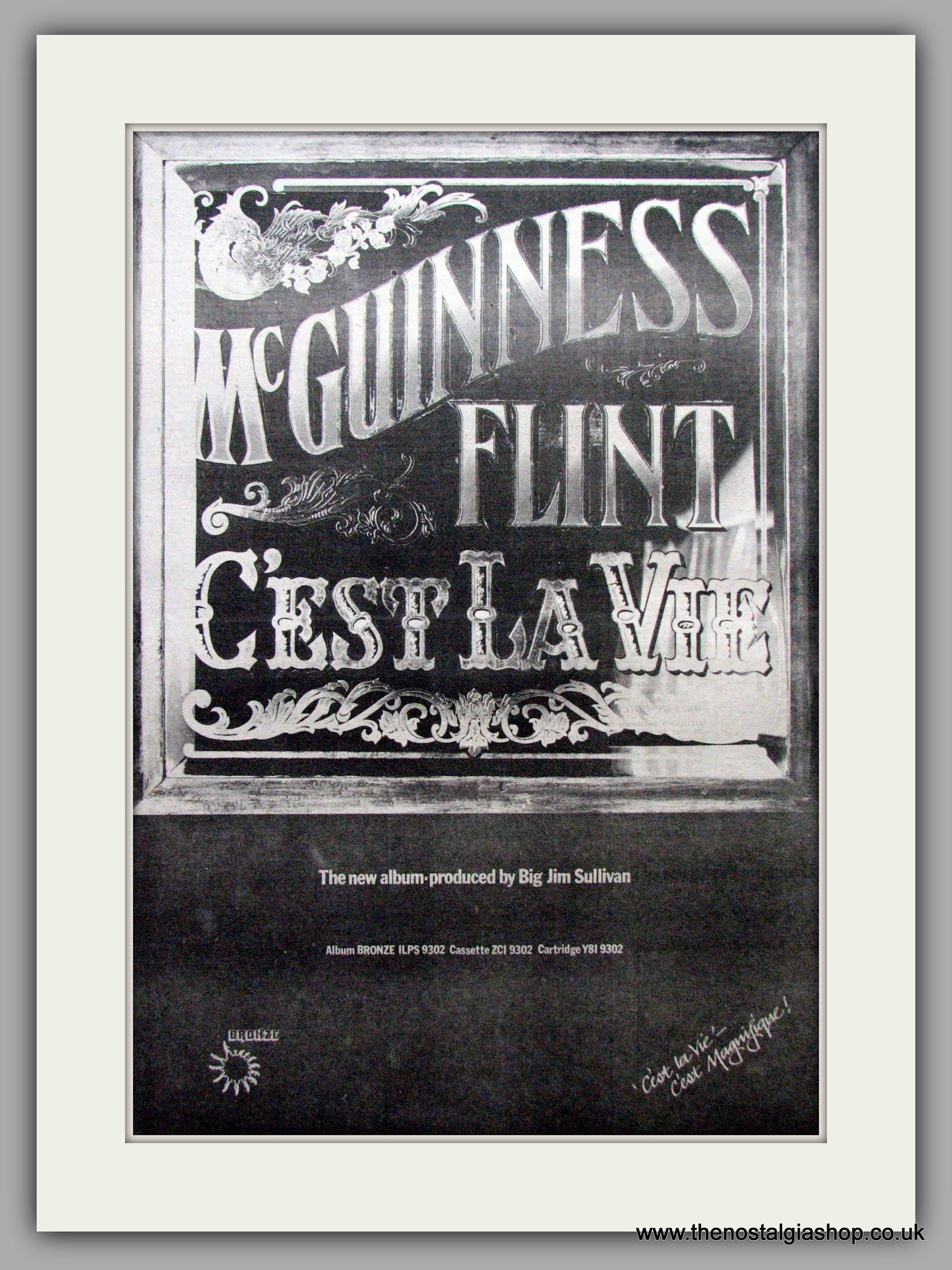 McGuinness Flint. C'est La Vie. Vintage Advert 1974 (ref AD9563). Presented and supplied in a cream bevel cut mount with backing card and clear bag. Ready to fit in a 20x16 inch frame. The mounted advert will be posted via courier and well packed - protected with a sheet of hardboard to keep it rigid. Any questions or enquiries, please get in touch, we are here to help! All our adverts, unless clearly stated are originals from the date shown. They make excellent pieces of wall art and stunning gifts. Many are rare and hard to find and once sold, may not be replaced. Remember you are buying a piece of history. Website watermark is not on original.