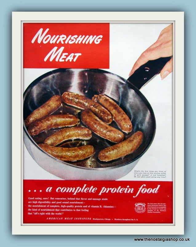 Nourishing Meat. A complete protein food! Classic original advert 1947. Presented in a 20 x 16 Inch cream mount with backing board and clear bag. Ready to Frame. All our adverts, unless clearly stated are Originals from the date shown. They make excellent pieces of wall art and stunning gifts. Many are rare and hard to find and once sold, may not be replaced. Remember you are buying a piece of history. Website watermarks are not on original. Adverts will be well packed with hardboard to keep rigid in the post.