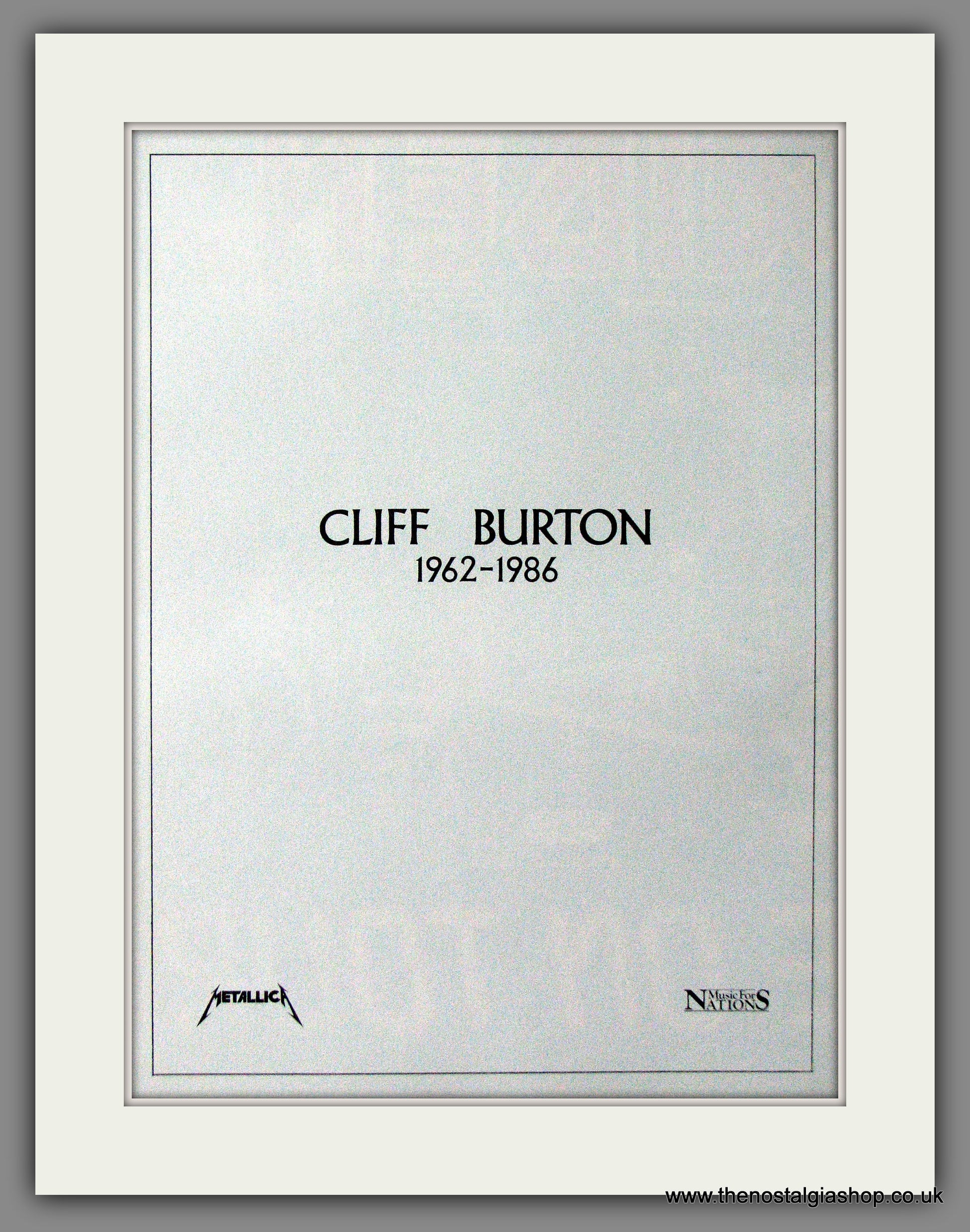 Metallica. Cliff Burton 1962 - 1986. Classic Original advert 1986. Presented and Supplied in cream bevel cut mount with backing card and clear bag. Ready to fit in 14 x 11 inch frame. Want it framing? If so, buy this then go to Frames Available Category. Click to buy on the suitable frame and we will do the rest. All our adverts, unless clearly stated are Originals from the date shown. They make excellent pieces of wall art and stunning gifts. Many are rare and hard to find and once sold, may not be replaced. Remember you are buying a piece of history. Website watermark is not on original. James Hetfield, Kirk Hammett, Lars Ulrich, Jason Newstead, Cliff Burton.