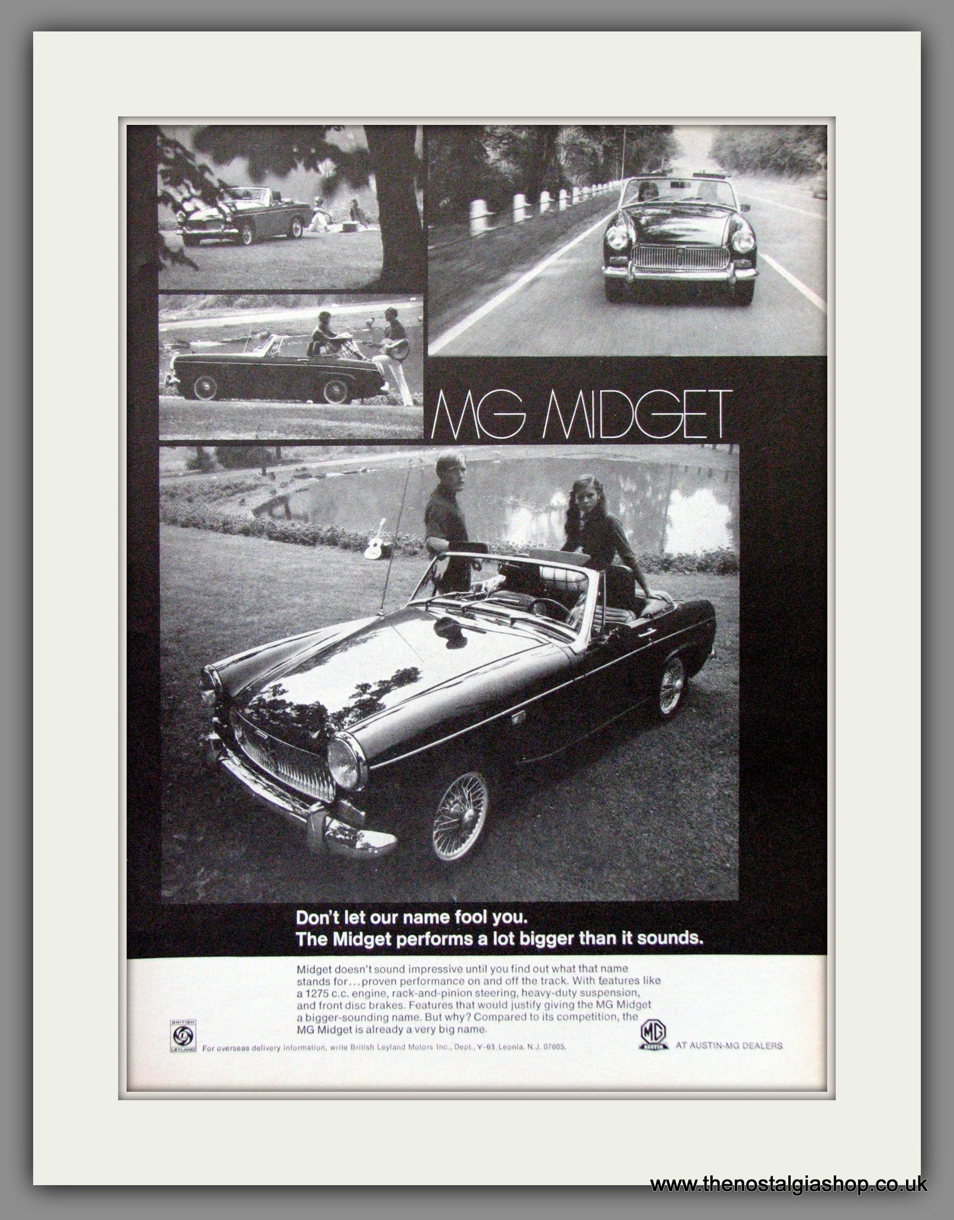MG Midget. Vintage Advert. Classic Original American advert 1969. Presented and Supplied in cream bevel cut mount, size 14 x 11 inches with backing card and clear bag. Ready to frame. Want it framing? If so, buy this then go to Frames Available Category. Click to buy on the suitable frame and we will do the rest. All our adverts, unless clearly stated are Originals from the date shown They make excellent pieces of wall art and stunning gifts. Many are rare and hard to find and once sold, may not be replaced. Remember you are buying a piece of history. Website watermark is not on original.