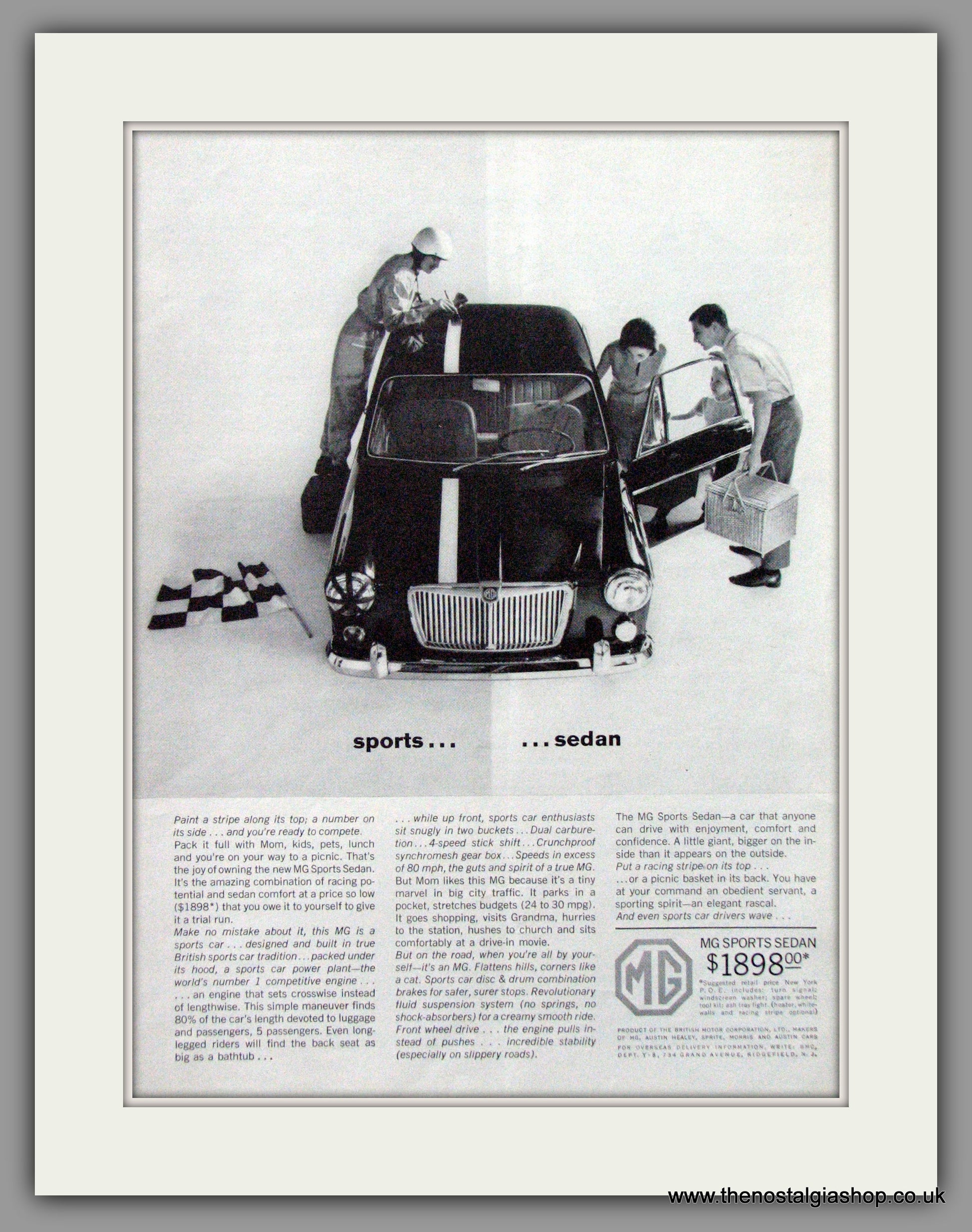 MG Sports Sedan. Vintage Advert. Classic Original American advert 1963. Presented and Supplied in cream bevel cut mount, size 14 x 11 inches with backing card and clear bag. Ready to frame. Want it framing? If so, buy this then go to Frames Available Category. Click to buy on the suitable frame and we will do the rest. All our adverts, unless clearly stated are Originals from the date shown They make excellent pieces of wall art and stunning gifts. Many are rare and hard to find and once sold, may not be replaced. Remember you are buying a piece of history. Website watermark is not on original.