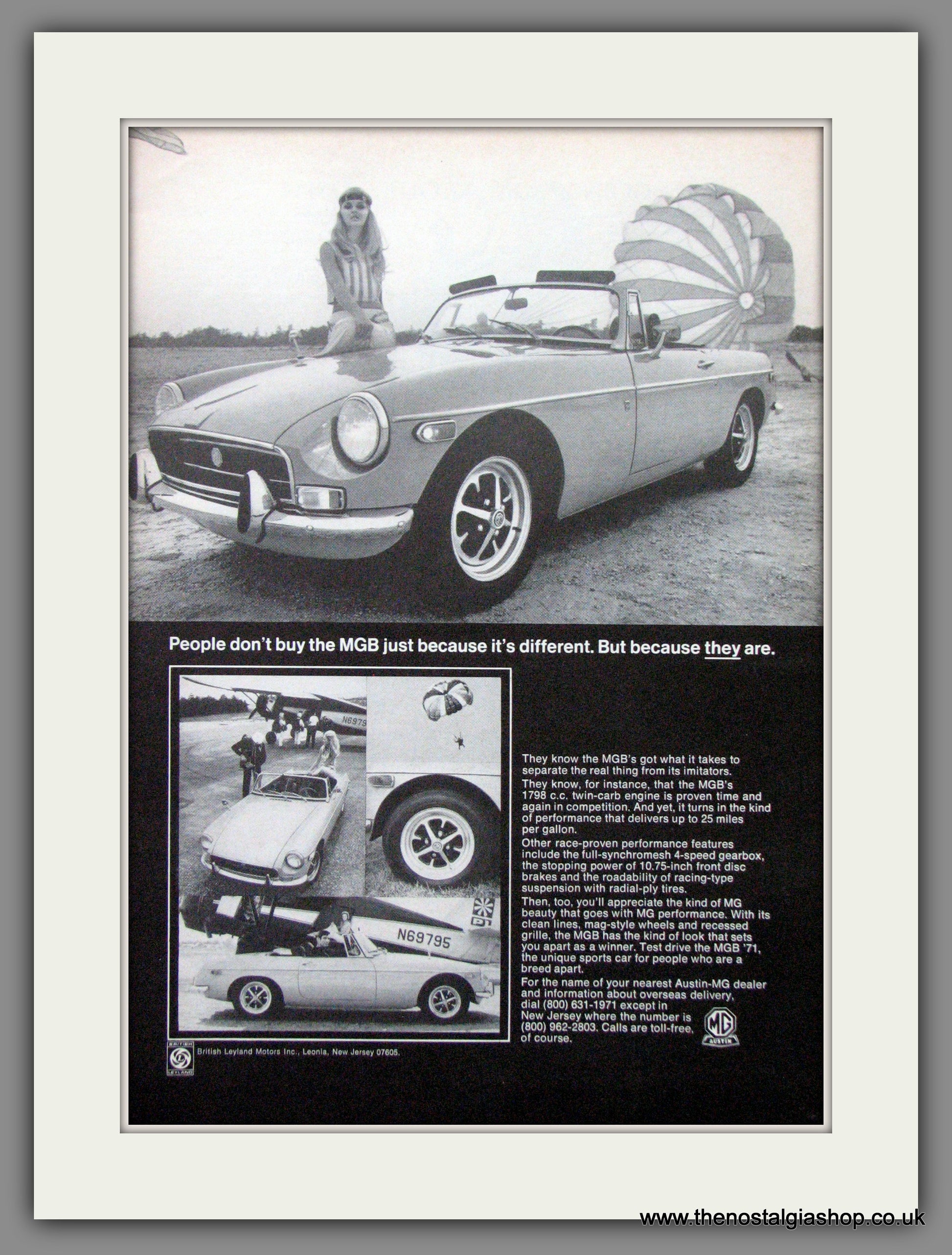 MGB, Be Different. Vintage Advert. Classic Original American advert 1971. Presented and Supplied in cream bevel cut mount, size 14 x 11 inches with backing card and clear bag. Ready to frame. Want it framing? If so, buy this then go to Frames Available Category. Click to buy on the suitable frame and we will do the rest. All our adverts, unless clearly stated are Originals from the date shown They make excellent pieces of wall art and stunning gifts. Many are rare and hard to find and once sold, may not be replaced. Remember you are buying a piece of history. Website watermark is not on original.