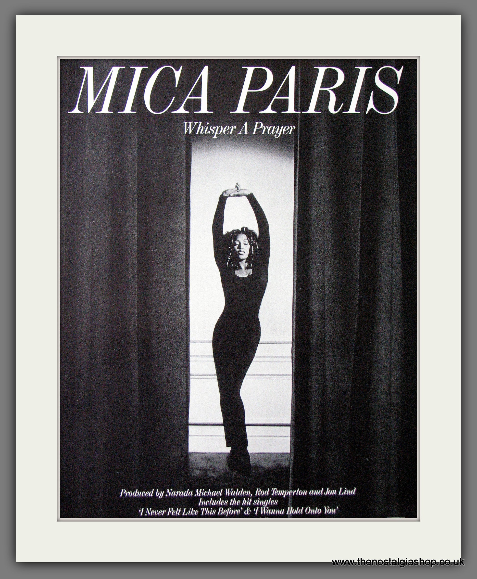 Mica Paris, Whisper A Prayer. Classic Original advert 1993. Presented and Supplied in cream bevel cut mount with backing card and clear bag. Ready to fit in 14 x 11 inch frame. Want it framing? If so, buy this then go to Frames Available Category. Click to buy on the suitable frame and we will do the rest. All our adverts, unless clearly stated are Originals from the date shown. They make excellent pieces of wall art and stunning gifts. Many are rare and hard to find and once sold, may not be replaced. Remember you are buying a piece of history. Website watermark is not on original.