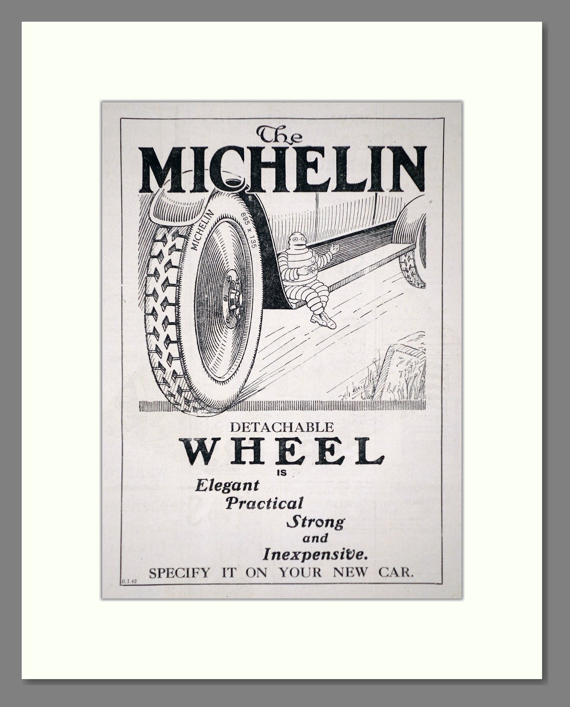 Michelin - Wheel. Vintage Advert. This is a classic original advert from 1920. Presented and supplied in a cream bevel cut mount with backing card and clear bag. Ready to fit in a 14 x 11 inches frame. The mounted advert will be posted via courier and well packed - protected with a sheet of hardboard to keep it rigid. Any questions or enquiries, please get in touch, we are here to help! All our adverts, unless clearly stated are originals from the date shown. They make excellent pieces of wall art and stunning gifts. Many are rare and hard to find and once sold, may not be replaced. Remember you are buying a piece of history. Website watermark is not on original. Vintage Tyres, Vintage Wheels