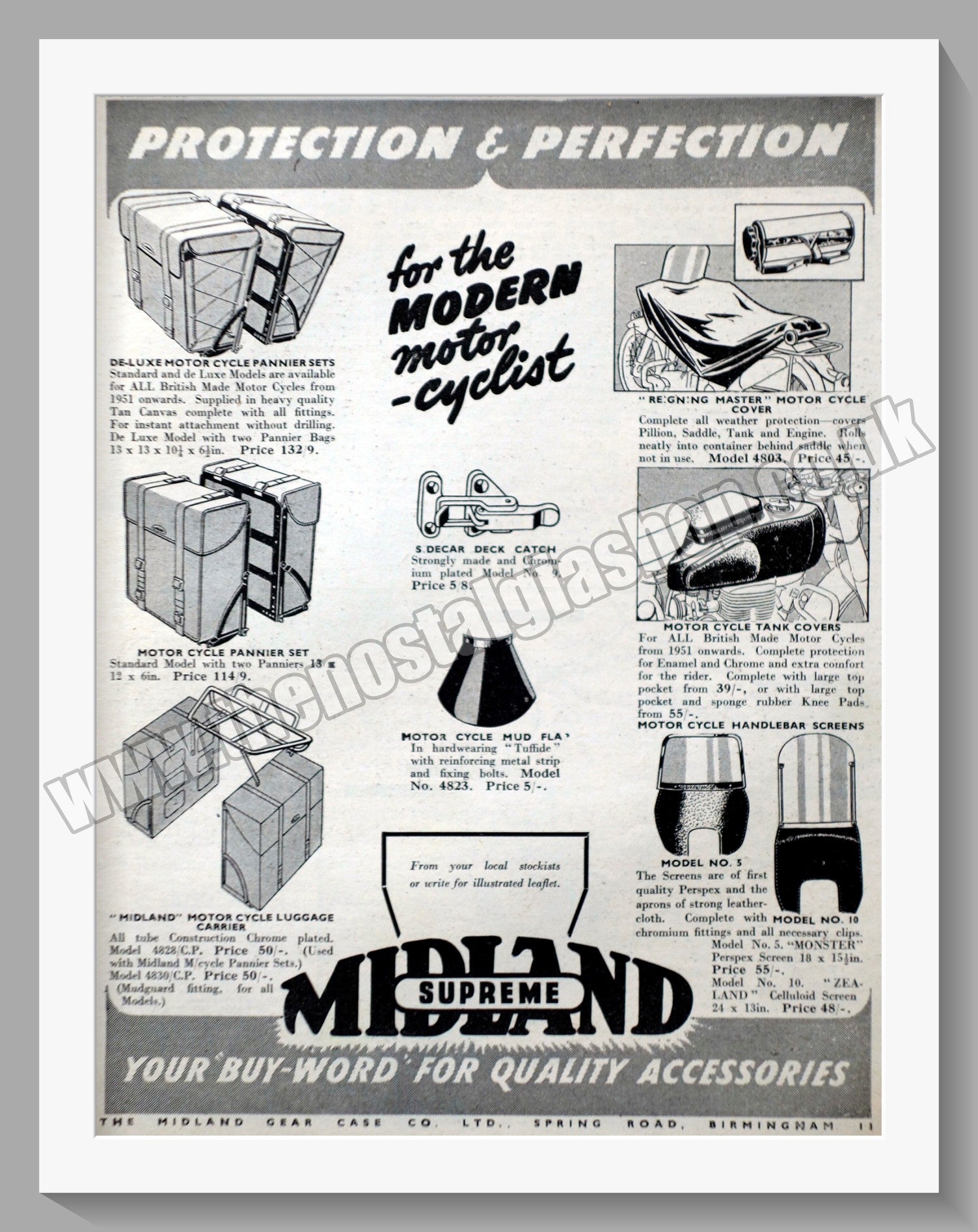 Midland Supreme Pannier Sets. Original Vintage Advert 1953. Presented and Supplied in a 14 x 11 Inch, cream bevel cut mount with backing card and clear bag. Ready to frame. All our adverts, unless clearly stated are Originals from the date shown They make excellent pieces of wall art and stunning gifts. Many are rare and hard to find and once sold, may not be replaced. Remember you are buying a piece of history. Website watermark is not on original. Motorcycle Accessories.