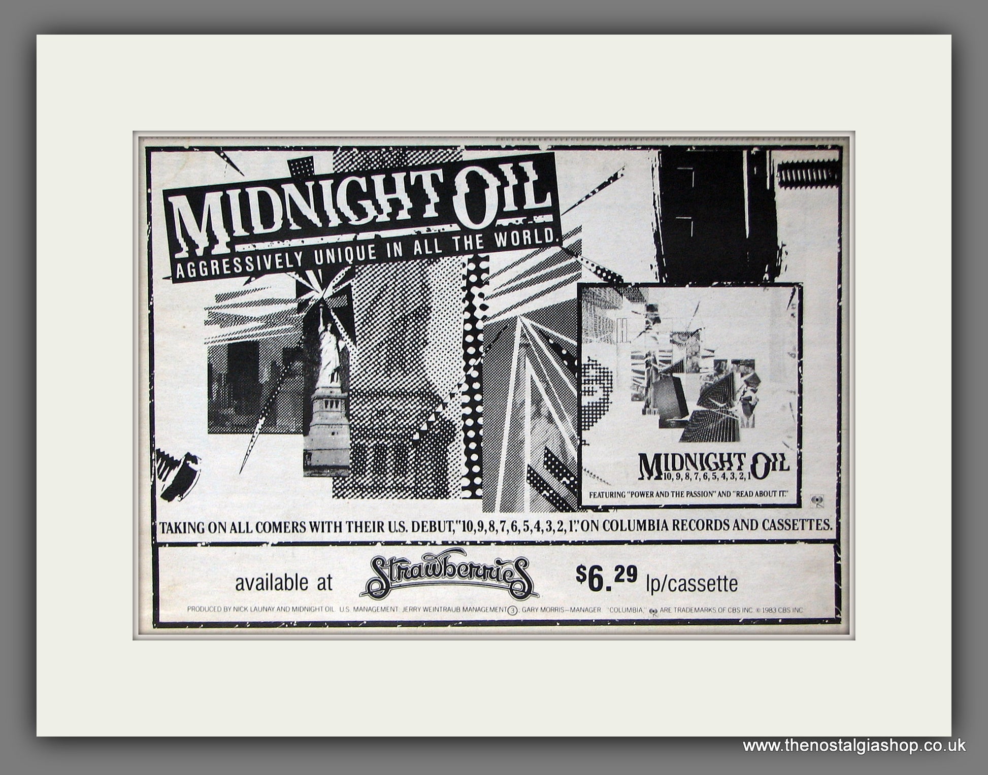 Midnight Oil Debut Album. Classic Original advert 1983. Presented and supplied in a cream bevel cut mount with backing card and clear bag. Ready to fit in 14 x 11 inch frame. The mounted advert will be posted via courier and well packed - protected with a sheet of hardboard to keep it rigid. Any questions or inquiries, please get in touch, we are here to help! All our adverts, unless clearly stated are Originals from the date shown. They make excellent pieces of wall art and stunning gifts. Many are rare and hard to find and once sold, may not be replaced. Remember you are buying a piece of history. Website watermark is not on original.
