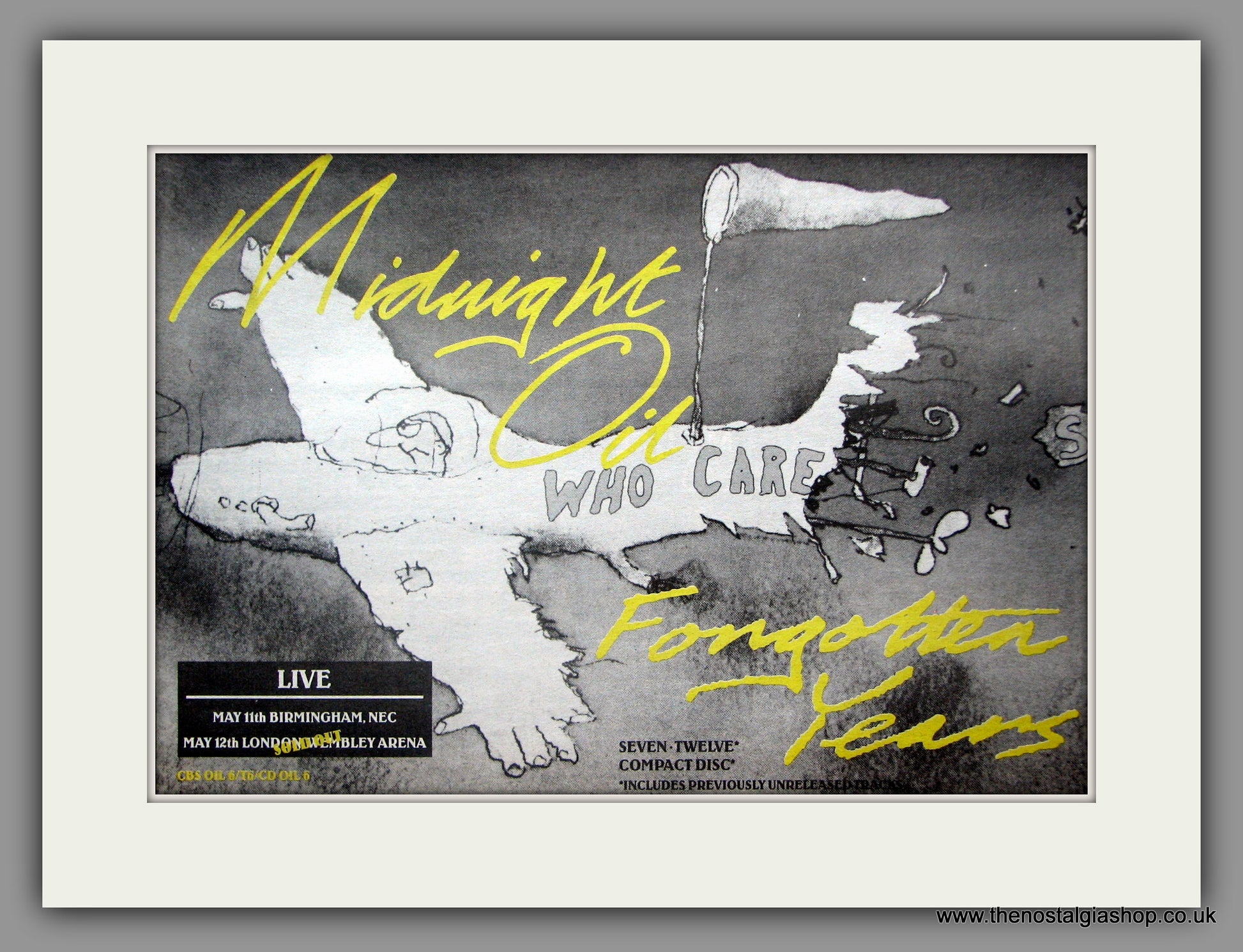 Midnight Oil. Forgotten Years. Classic Original advert 1990. Presented in cream bevel cut mount with backing card and clear bag. Ready to fit in 14 x 11 inch frame. Want it framing? If so, buy this then go to Frames Available Category. Click to buy on the suitable frame and we will do the rest. All our adverts, unless clearly stated are Originals from the date shown. They make excellent pieces of wall art and stunning gifts. Many are rare and hard to find and once sold, may not be replaced. Remember you are buying a piece of history. Website watermark is not on original.