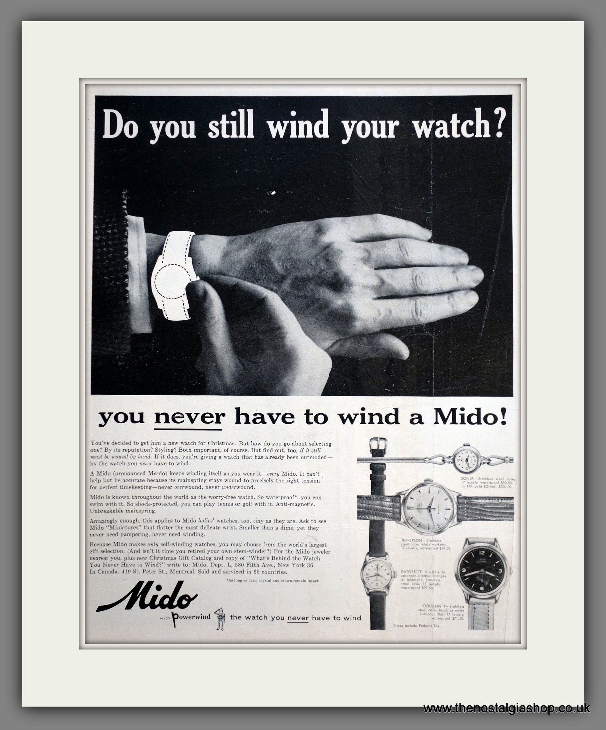 Mido Watches. Original Vintage Advert 1957. Presented and supplied in a cream bevel cut mount with backing card and clear bag. Ready to fit in a 18 x 14 inch frame. All our adverts, unless clearly stated are Originals from the date shown. They make excellent pieces of wall art and stunning gifts. Many are rare and hard to find and once sold, may not be replaced. Remember you are buying a piece of history. Website watermark is not on original.