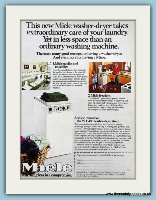 Miele Washer-Dryer. Miele...Anything less is a compromise. Classic original advert 1977. Presented in cream bevel cut mount with backing card. Ready to fit in 14 x 11 inch frame. Want it framing? If so, buy this then go to Frames Available Catagory. Click to buy on the suitable frame and we will do the rest. All our adverts, unless clearly stated are Originals from the date shown. They make excellent pieces of wall art and stunning gifts. Many are rare and hard to find and once sold, may not be replaced. Remember you are buying a piece of history. Website watermark is not on original.
