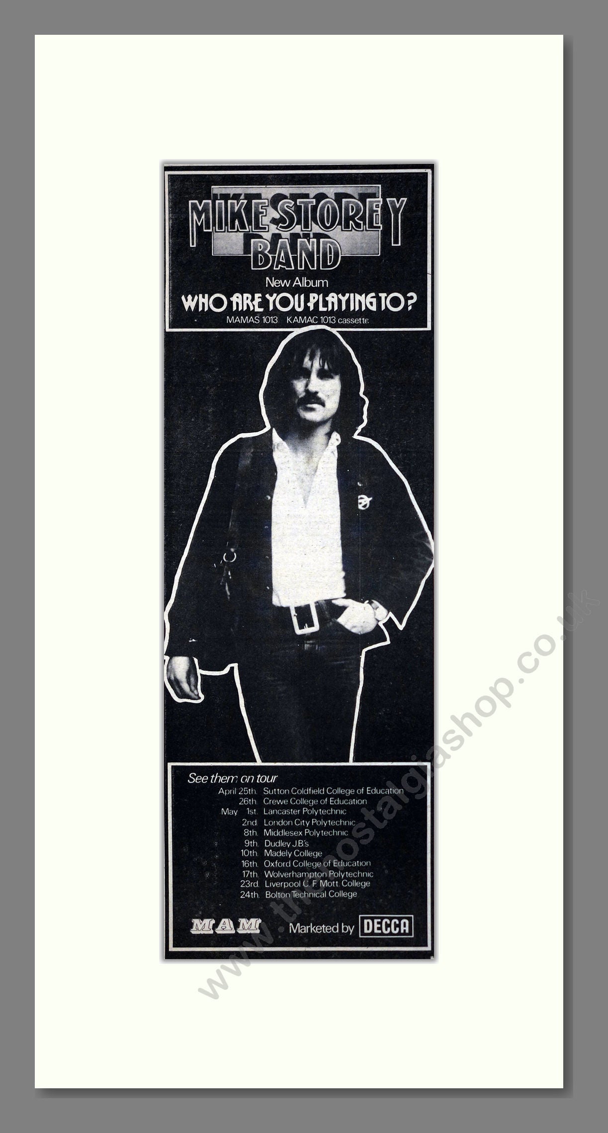 Mike Storey Band - Who Are You Playing To. Vintage Advert. This is a classic original advert from 1975. Presented and supplied in a cream bevel cut mount with backing card and clear bag. Ready to fit in a 20 x 10 inches frame. The mounted advert will be posted via courier and well packed - protected with a sheet of hardboard to keep it rigid. Any questions or enquiries, please get in touch, we are here to help! All our adverts, unless clearly stated are originals from the date shown. They make excellent pieces of wall art and stunning gifts. Many are rare and hard to find and once sold, may not be replaced. Remember you are buying a piece of history. Website watermark is not on original.