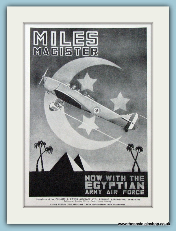 Miles Magister Aircraft. Now with the Egyptian army air force. Classic original advert 1938. Presented in cream bevel cut mount with backing card and clear bag. Ready to fit in 14 x 11 inch frame. Want it framing? If so, buy this then go to Frames Available Category. Click to buy on the suitable frame and we will do the rest. All our adverts, unless clearly stated are Originals from the date shown. They make excellent pieces of wall art and stunning gifts. Many are rare and hard to find and once sold, may not be replaced. Remember you are buying a piece of history. Website watermark is not on original.