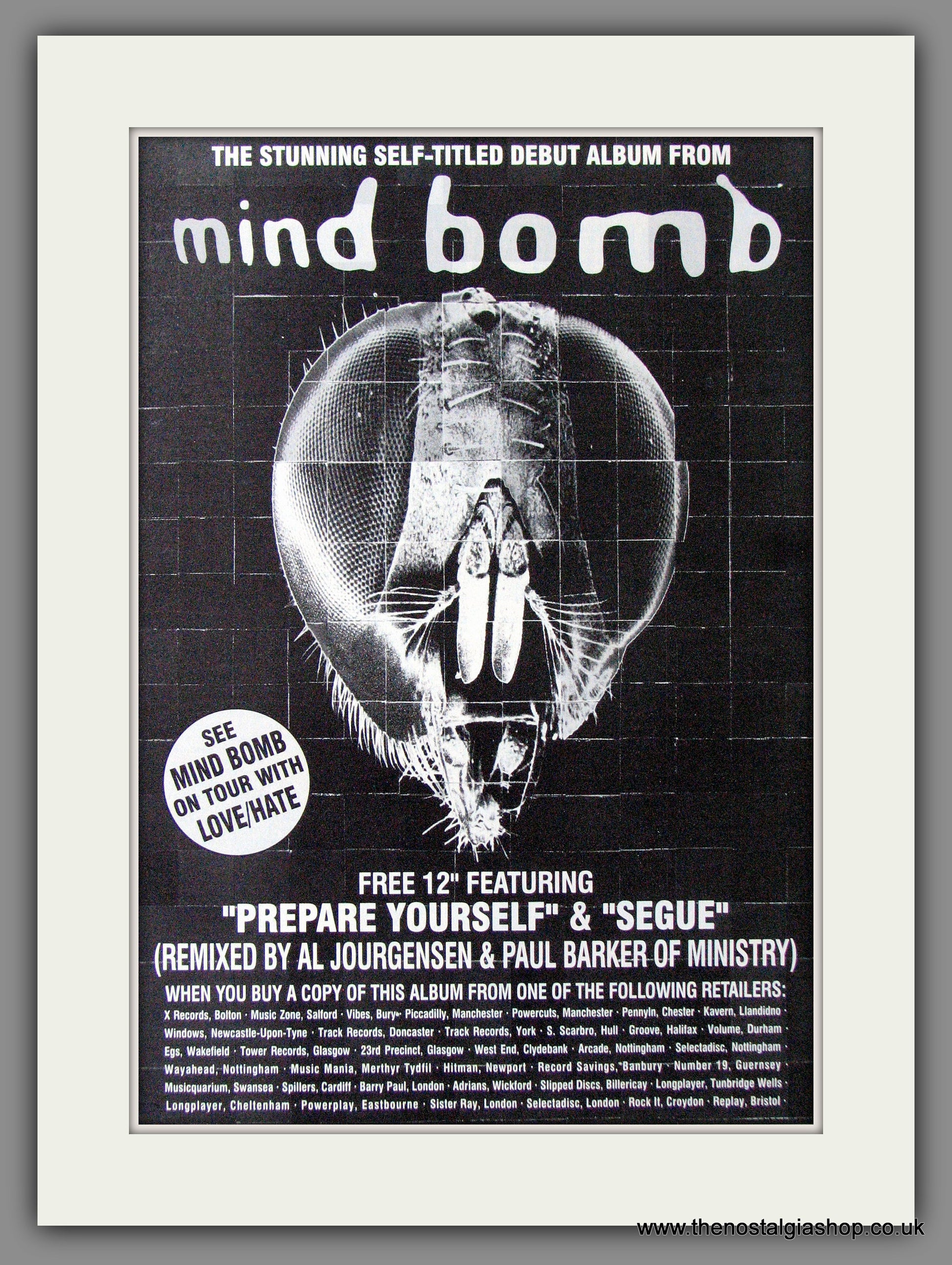 Mind Bomb, Debut Album. Classic Original advert 1993. Presented and Supplied in cream bevel cut mount with backing card and clear bag. Ready to fit in 14 x 11 inch frame. Want it framing? If so, buy this then go to Frames Available Category. Click to buy on the suitable frame and we will do the rest. All our adverts, unless clearly stated are Originals from the date shown. They make excellent pieces of wall art and stunning gifts. Many are rare and hard to find and once sold, may not be replaced. Remember you are buying a piece of history. Website watermark is not on original.